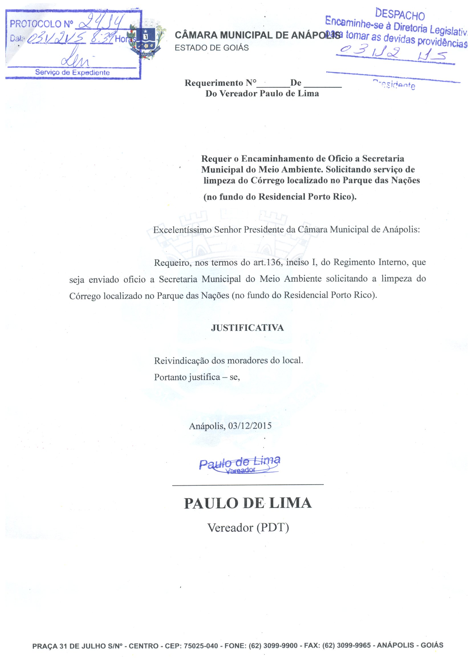 À SECRETARIA MUNICIPAL DE OBRAS, SERVIÇOS URBANOS E HABITAÇÃO, SOLICITANDO A LIMPEZA DO CÓRREGO LOCALIZADO NO PARQUE DAS NAÇÕES, NO FUNDO DO RESIDENCIAL PORTO RICO.