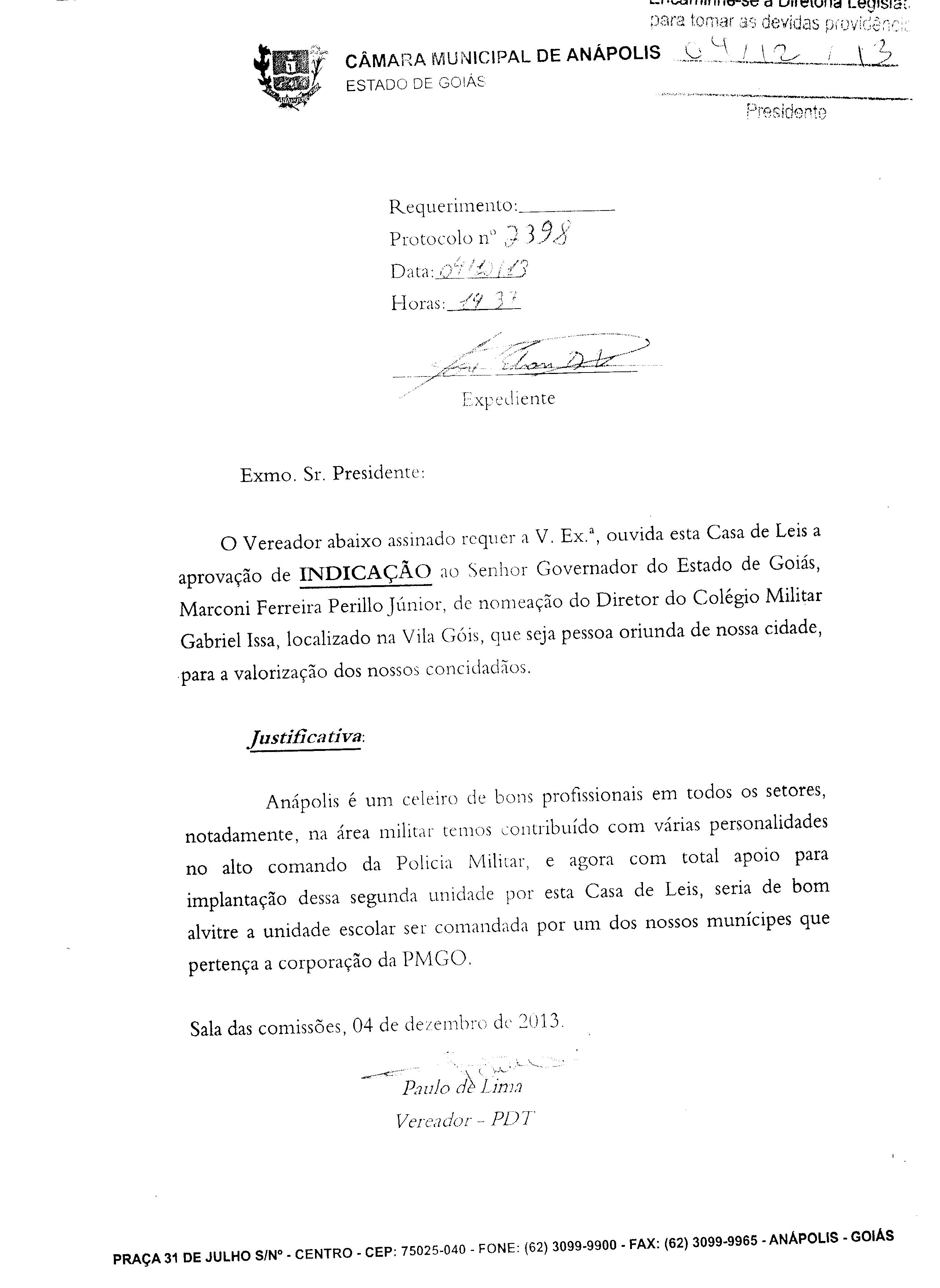 À APROVAÇÃO DE INDICAÇÃO AO SENHOR GOVERNADOR DO ESTADO DE GOIÁS, MARCONE FERREIRA PERILLO JÚNIOR, DE NOMEAÇÃO DO DIREITO DO COLÉGIO MILITAR GABRIEL ISSA, LOCALIZADO NA VILA GÓIS, QUE SEJA PESSOA ORIUNDA DE NOSSA CIDADE, PARA A VALORIZAÇÃO DOS NOSSOS CONCIDADÃOS.