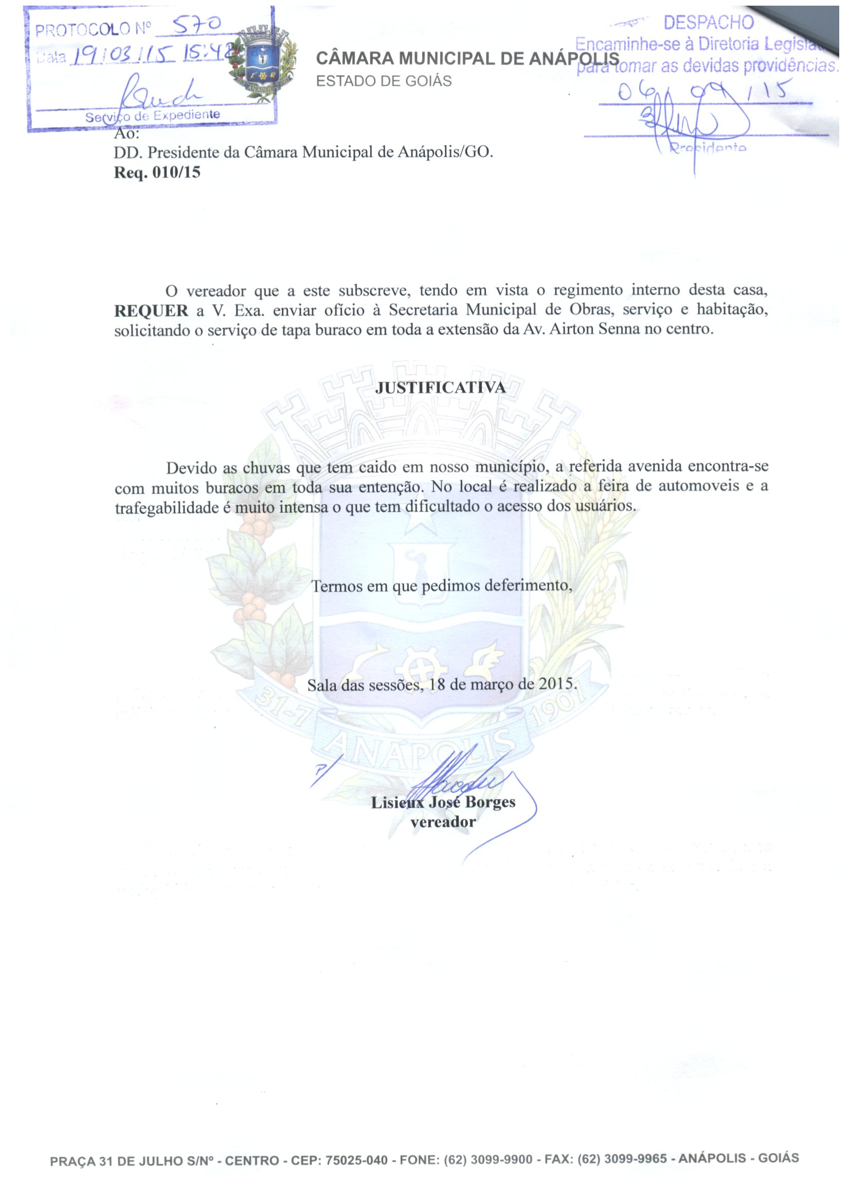 O VEREADOR QUE A ESTE SUBSCREVE, TENDO EM VISTA O REGIMENTO INTERNO DESTA CASA, REQUER A V. EXª. ENVIAR OFÍCIO À SECRETARIA MUNICIPAL DE OBRAS, SERVIÇOS E HABITAÇÃO, SOLICITANDO O SERVIÇO DE TAPA BURACO EM TODA A EXTENSÃO DA AV. AIRTON SENNA NO CENTRO.
