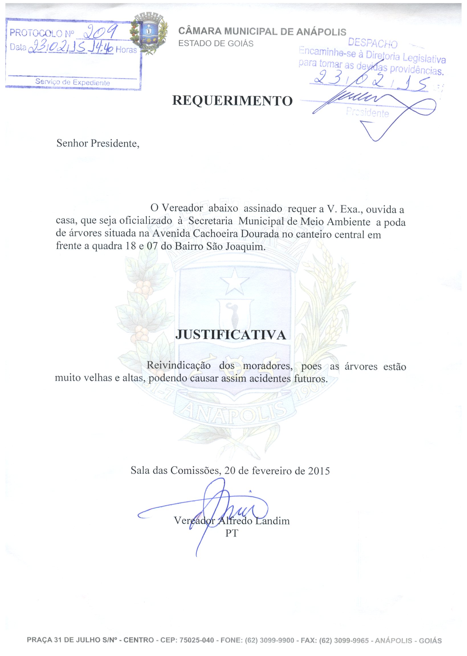 O VEREADOR ABAIXO ASSINADO REQUER À V. EXª., OUVIDA A CASA, QUE SEJA OFICIALIZADO À SECRETARIA MUNICIPAL DE MEIO AMBIENTE A PODA DE ÁRVORES SITUADA NA AVENIDA CACHOEIRA DOURADA NO CANTEIRO CENTRAL EM FRENTE A QUADRA 18 E 07 DO BAIRRO SÃO JOAQUIM.