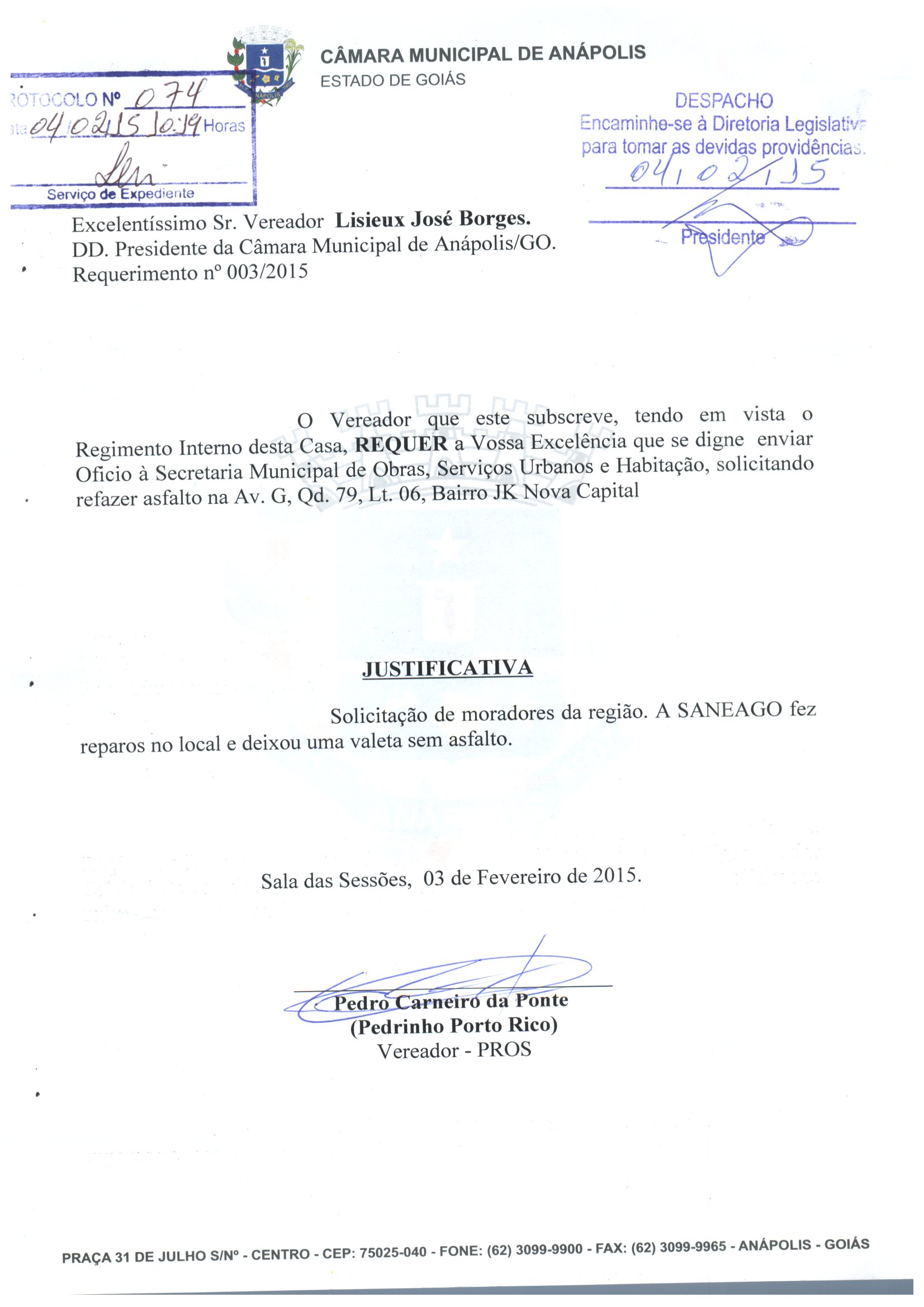 0 VEREADOR QUE ESTE SUBSCREVE, TENDO EM VISTA O REGIMENTO INTERNO DESTA CASA, REQUER A VOSSA EXCELÊNCIA QUE SE DIGNE ENVIAR OFÍCIO À SECRETARIA MUNICIPAL DE OBRAS, SERVIÇOS URBANOS E HABITAÇÃO, SOLICITANDO REFAZER ASFALTO NA AV. G, QD. 79, LT. 06, BAIRRO JK NOVA CAPITAL.