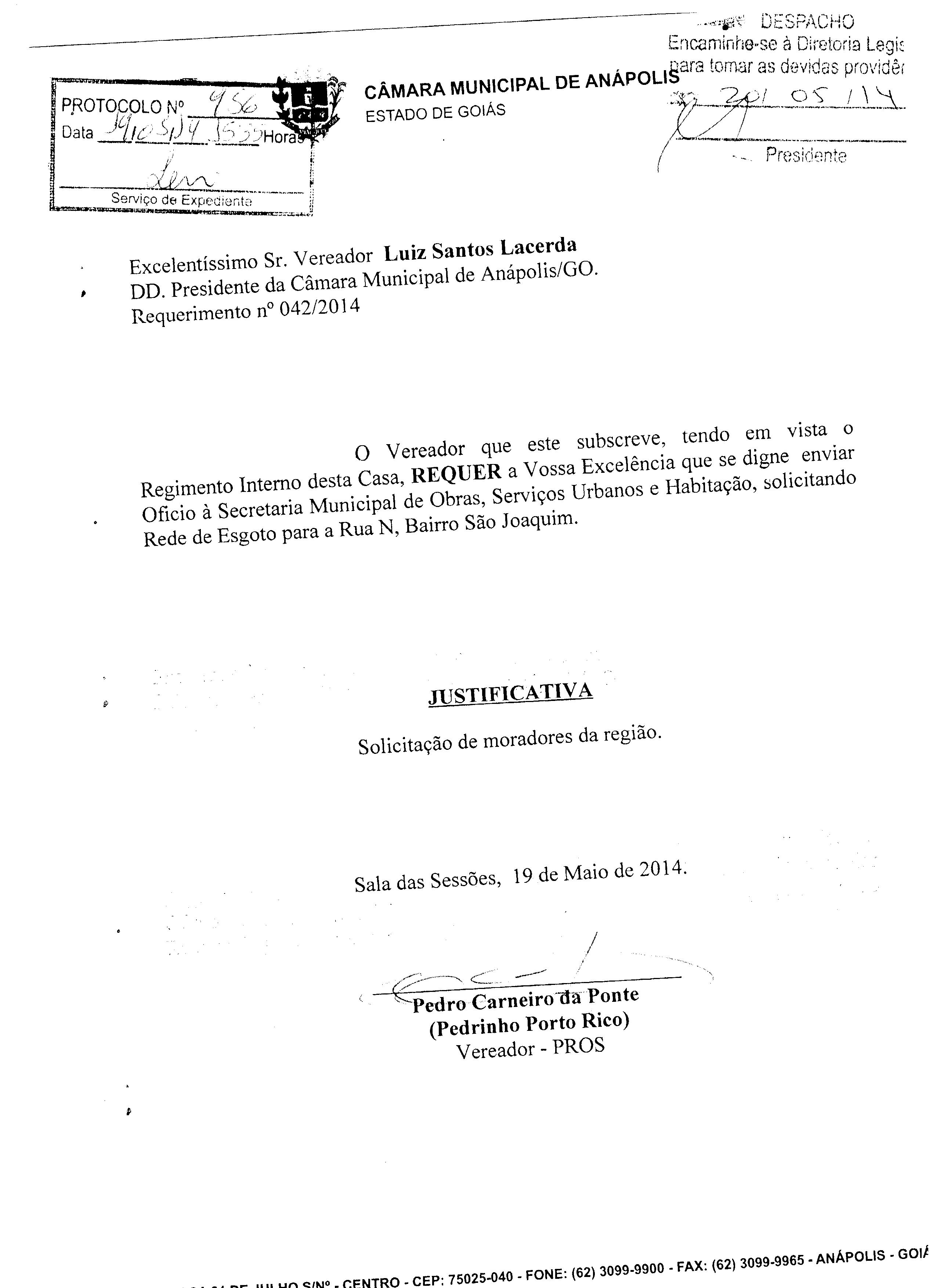 À SECRETARIA MUNICIPAL DE OBRAS, SERVIÇOS URBANOS E HABITAÇÃO, SOLICITANDO REDE DE ESGOTO PARA A RUA N, BAIRRO SÃO JOAQUIM.