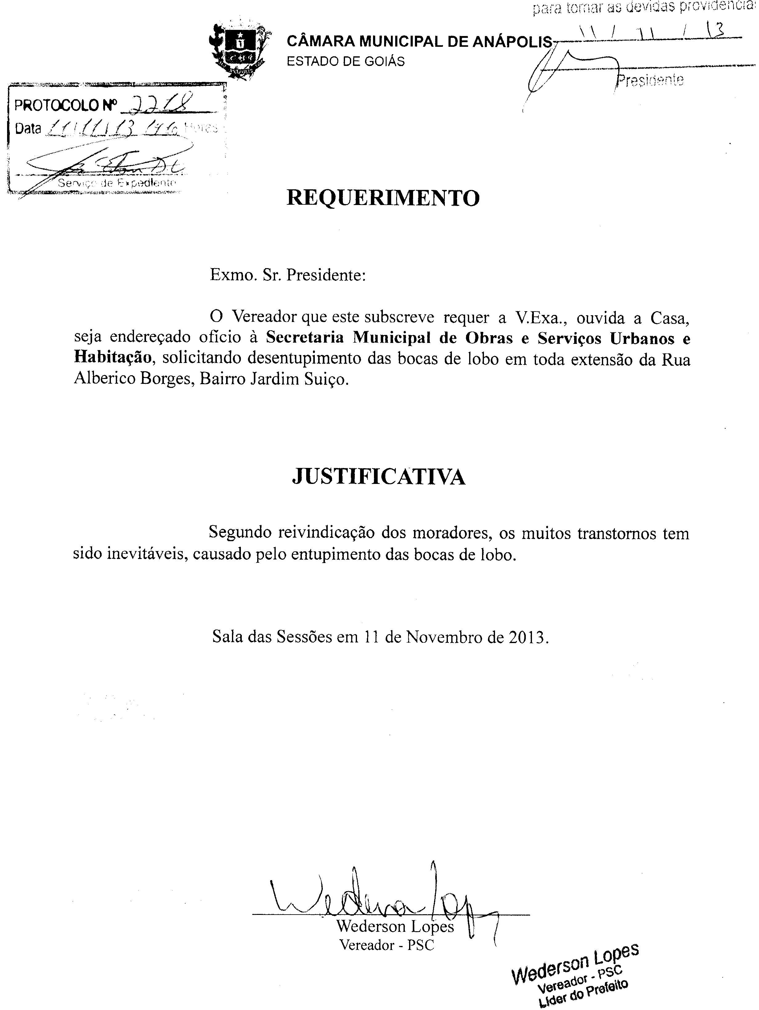 À SECRETARIA MUNICIPAL DE OBRAS E SERVIÇOS URBANOS E HABITAÇÃO, SOLICITANDO DESENTUPIMENTO DAS BOCAS DE LOBO EM TODA EXTENÇÃO DA RUA ALBERICO BORGES, BAIRRO JARDIM SUÍÇO.