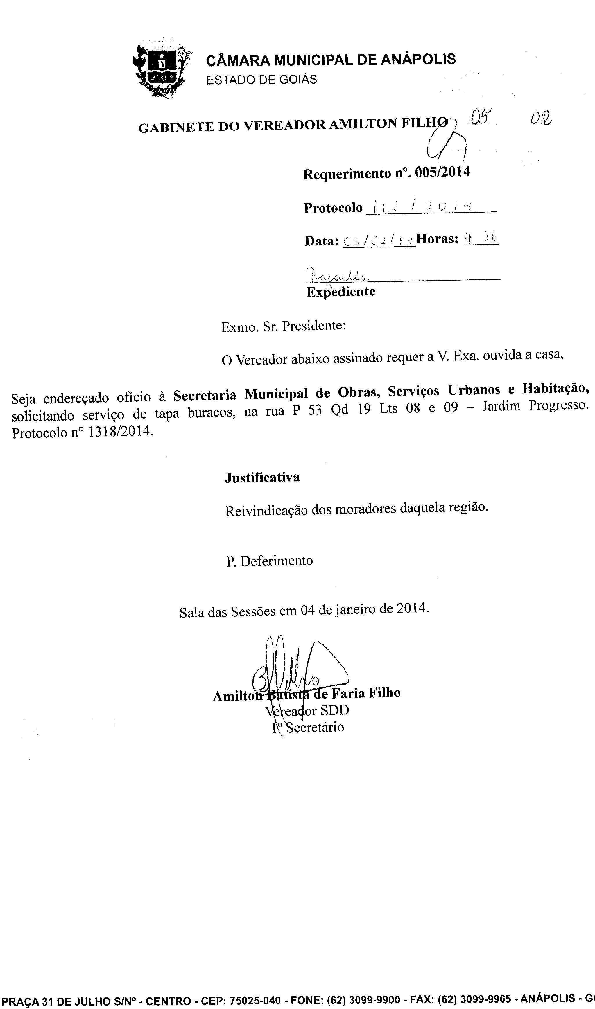 À SECRETARIA MUNICIPAL DE OBRAS, SERVIÇOS URBANOS E HABITAÇÃO, SOLICITANDO SERVIÇO DE TAPA BURACOS, NA RUA P 53, QD 19, LTS 08 E 09 - JARDIM PROGRESSO.