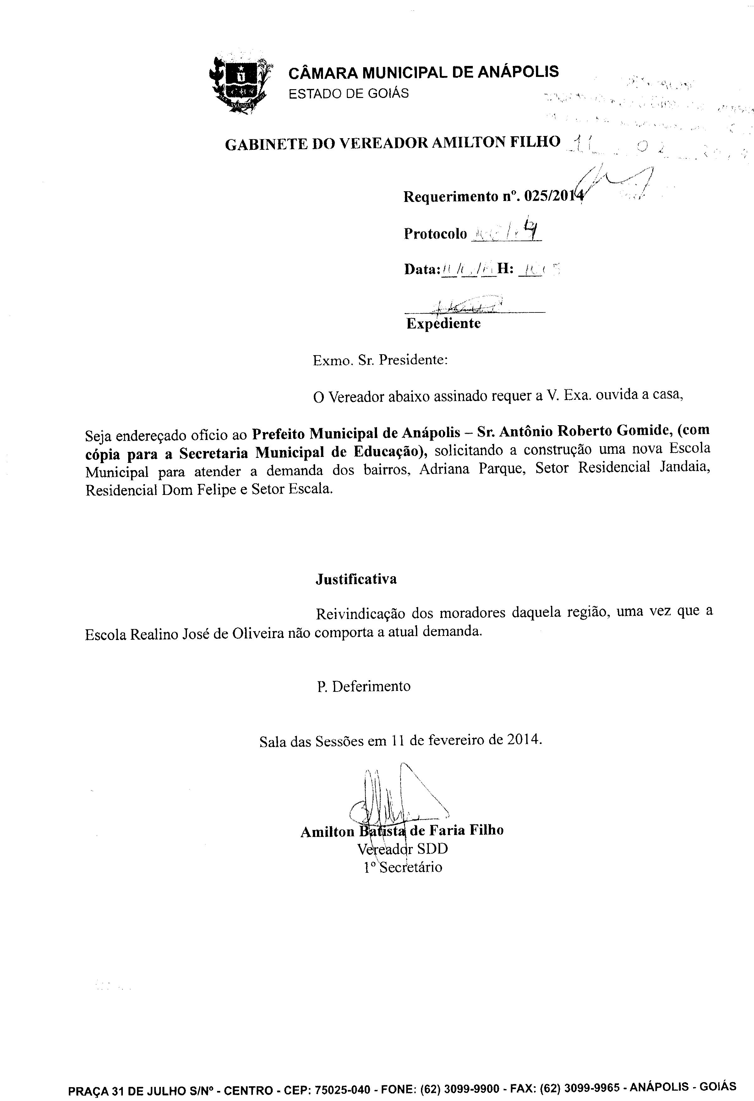 AO PREFEITO MUNICIPAL DE ANÁPOLIS-SR. ANTÔNIO ROBERTO GOMIDE,(COM CÓPIA PARA A SECRETARIA MUNICIPAL DE EDUCAÇÃO), SOLICITANDO A CONSTRUÇÃO UA NOVA ESCOLA MUNICIPAL PARA ENTENDER A DEMANDA DOS BAIRROS, ADRIANA PARQUE, SETOR RESIDENCIAL JANDAIA, RESIDENCIAL DOM FELIPE E SETOR ESCALA.