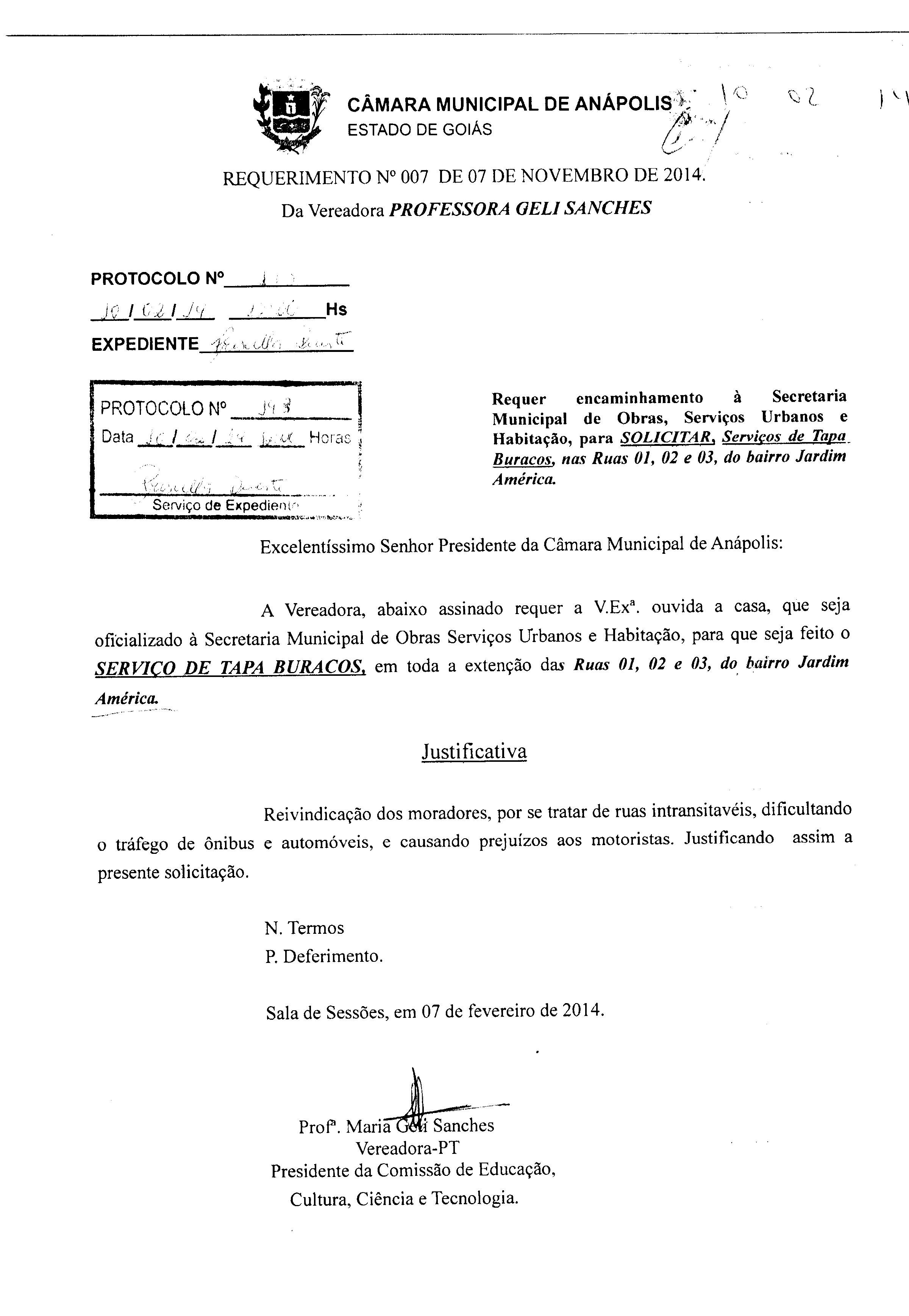 Á SECRETARIA MUNICIPAL DE OBRAS SERVIÇOS URBANOS E HABITAÇÃO, PARA QUE SEJA FEITO O SERVIÇO DE TAPA BURACO, EM TODA A EXTENÇÃO DAS RUAS 01,02 E 03 DO BAIRRO JARDIM AMÉRICA.