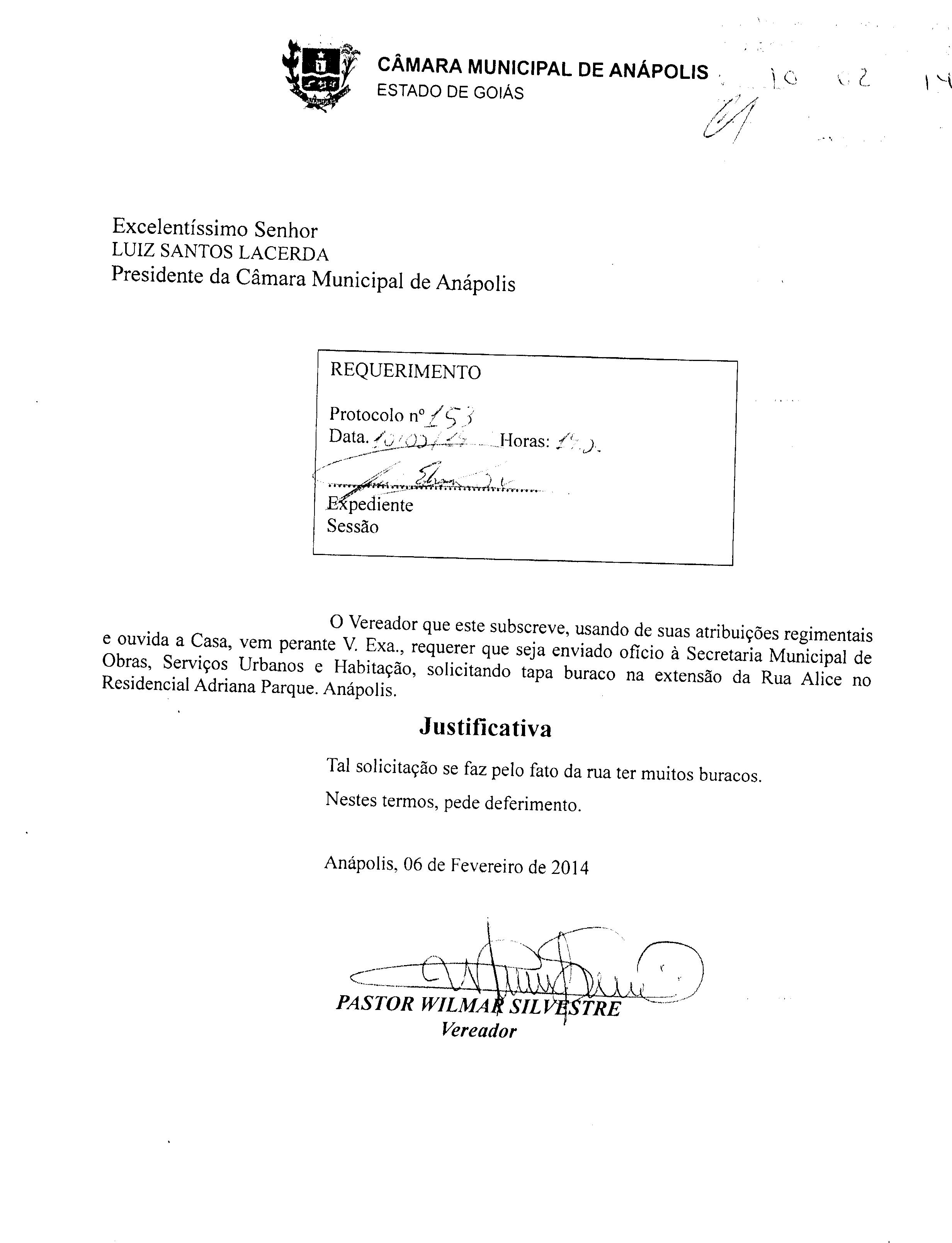 Á SECRETARIA MUNICIPAL DE OBRAS, SERVIÇOS URBANOS E HABITAÇÃO, SOLICITANDO TAPA BURACO NA EXTENSÃO DA RUA ALICE NO RESIDENCIAL ADRIANA PARQUE. ANÁPOLIS.