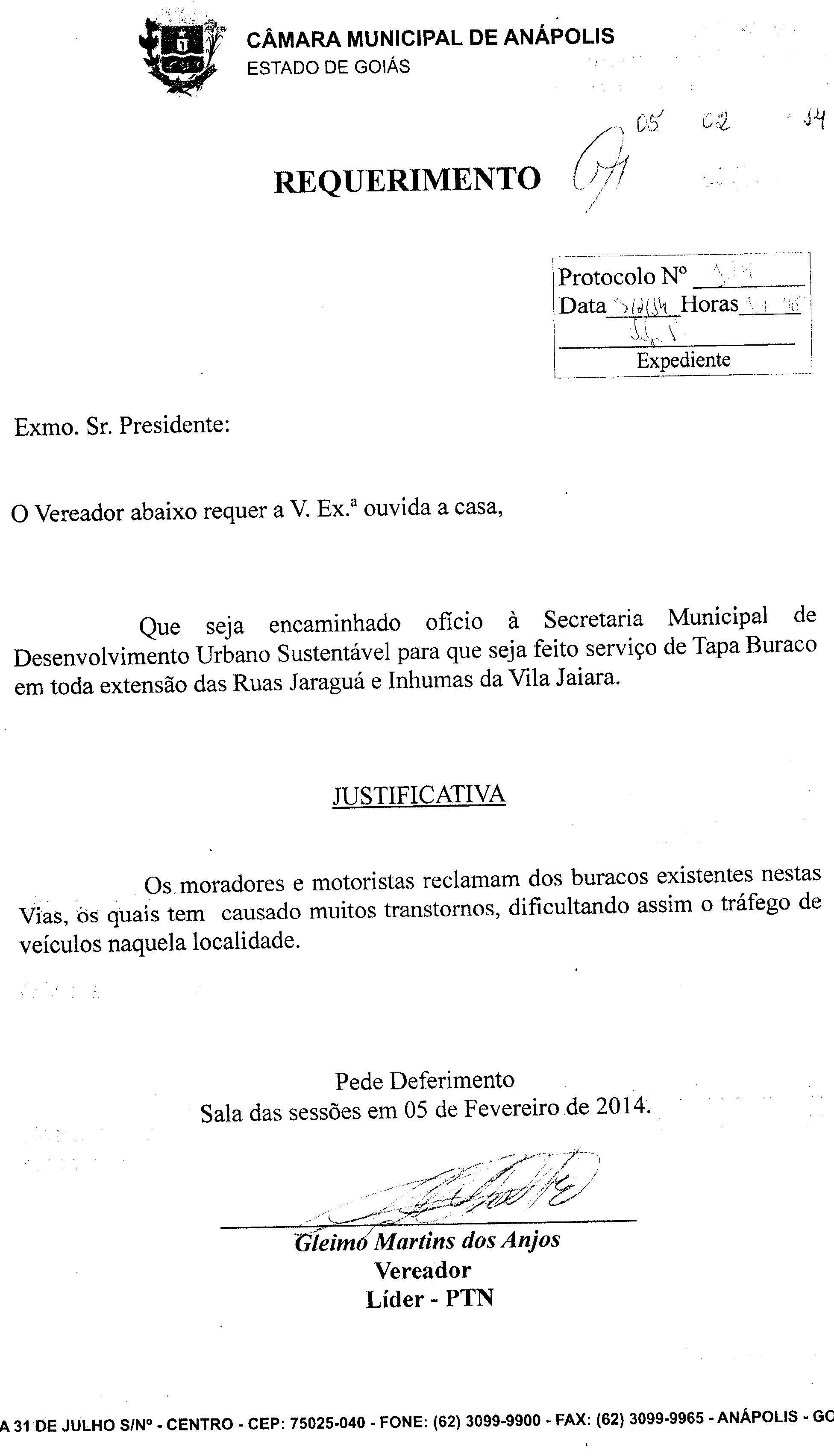 Á SECRETARIA MUNICIPAL DE DESENVOLVIMENTO URBANO SUSTENTÁVEL PARA QUE SEJA FEITO SERVIÇO DE TAPA BURACO EM TODA EXTENSÃO DAS RUAS JARAGUÁ E INHUMAS DA VILA JAIARA.