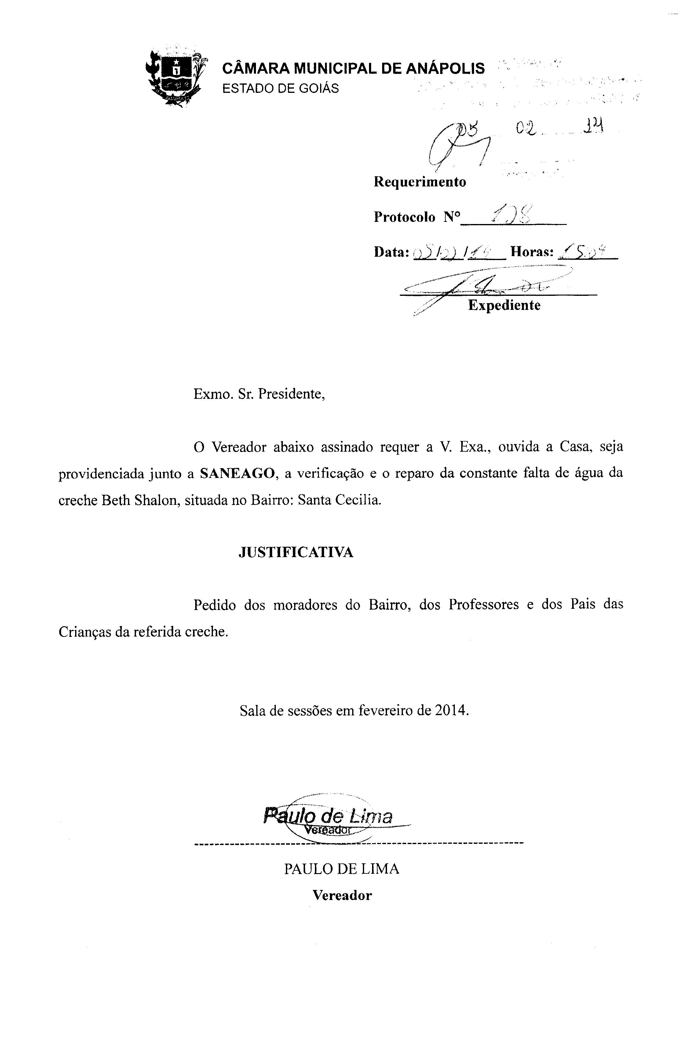 SEJA PROVIDENCIADA JUNTO A SANEAGO, VERIFICAÇÃO E O REPARO DA CONSTANTE FALTA DE ÁGUA DA CRECHE BETH SHALON, SITUADA NO BAIRRO: SANTA CECILIA.
