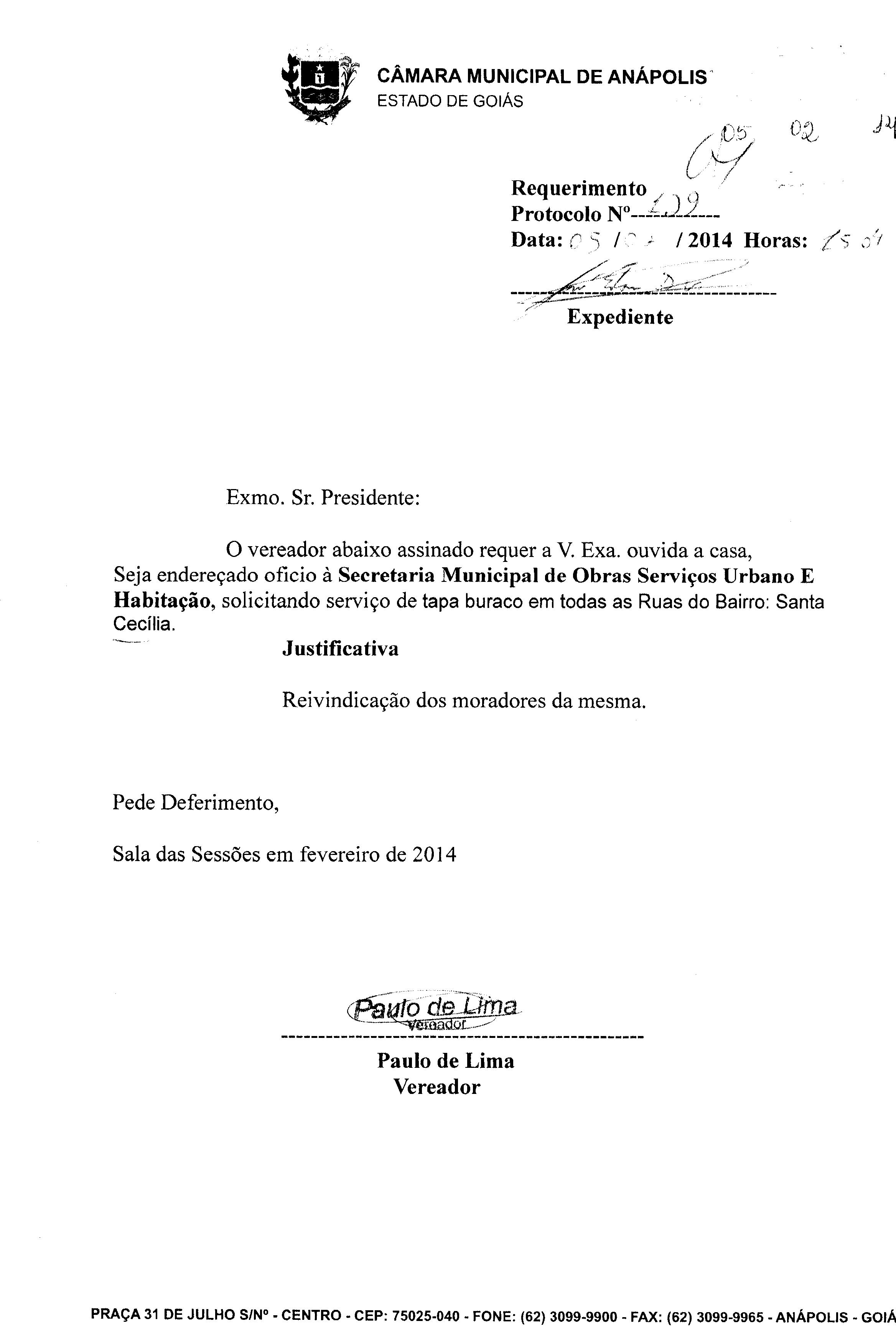 À SECRETARIA MUNICIPAL DE OBRAS SERVIÇOS URBANO E HABITAÇÃO, SOLICITANDO SERVIÇO DE TAPA BURACO EM TODAS AS RUAS DO BAIRRO SANTA CECÍLIA.
