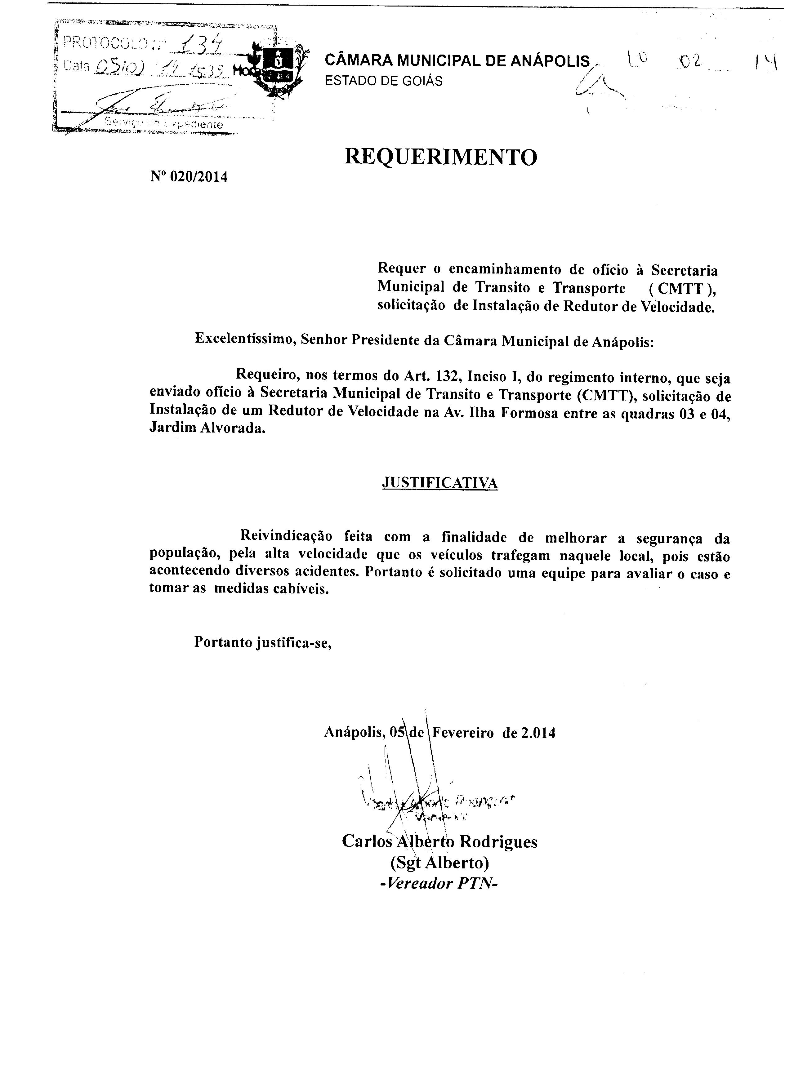 À SECRETARIA MUNICIPAL DE TRÂNSITO E TRANSPORTE (CMTT), SOLICITAÇÃO DE INSTALAÇÃO DE UM REDUTOR DE VELOCIDADE NA AV. ILHA FORMOSA ENTRE AS QUADRAS 03 E 04, JARDIM ALVORADA.