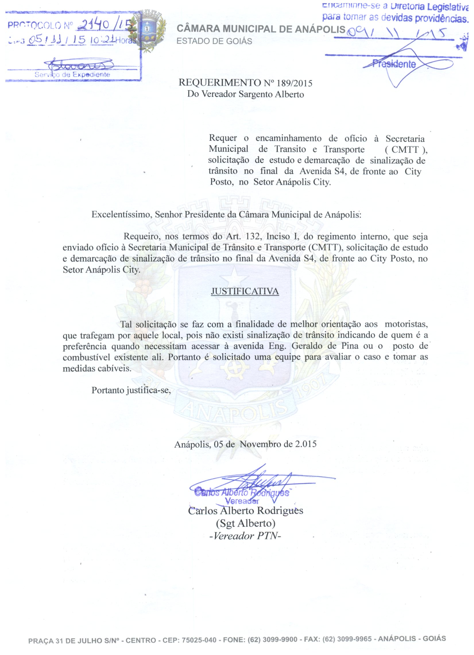À SECRETARIA MUNICIPAL DE TRÂNSITO E TRANSPORTE (CMTT) SOLICITAÇÃO DE ESTUDO E DEMARCAÇÃO DE SINALIZAÇÃO DE TRÂNSITO NO FINAL DA AVENIDA S4, DE FRONTE AO CITY POSTO, NO SETOR ANÁPOLIS CITY.