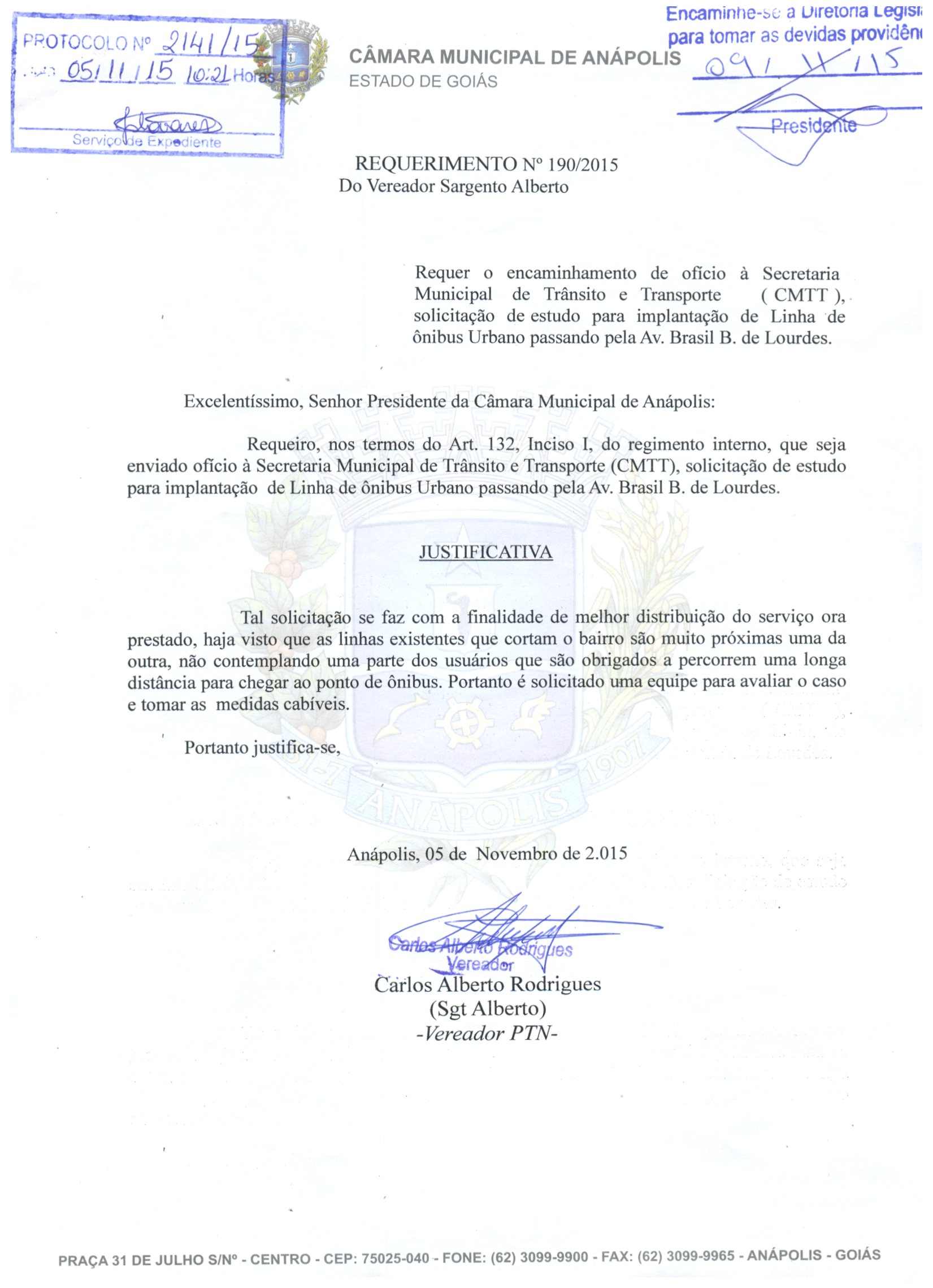 À SECRETARIA MUNICIPAL DE TRÂNSITO E TRANSPORTE (CMTT), SOLICITAÇÃO DE ESTUDO PARA IMPLANTAÇÃO DE LINHA DE ÔNIBUS URBANO PASSANDO PELA AVENIDA BRASIL, BAIRRO DE LOURDES.
