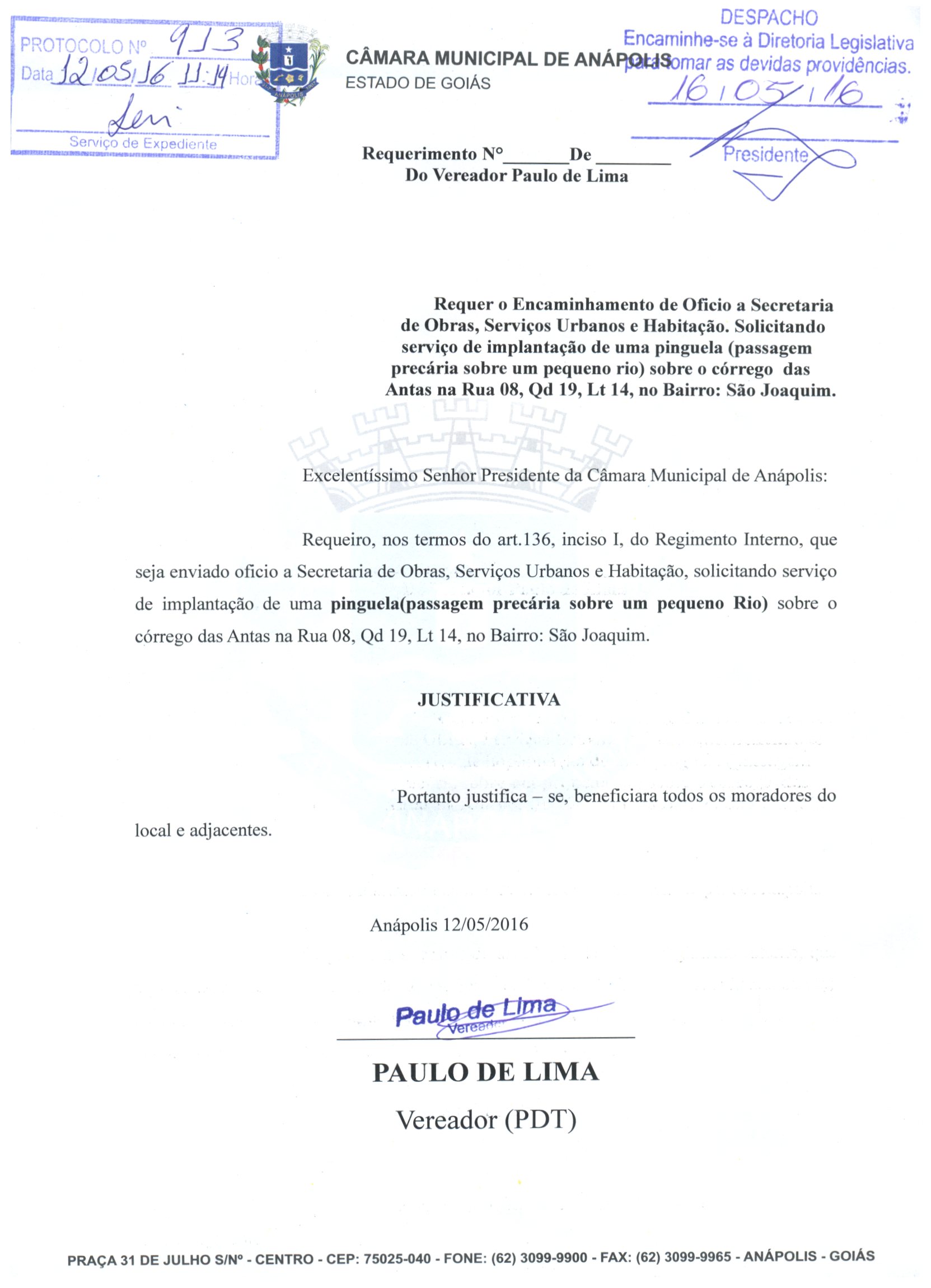 REQUER À SECRETARIA DE OFÍCIO A SECRETARIA DE OBRAS, SERVIÇOS URBANOS E HABITAÇÃO, SOLICITANDO SERVIÇO DE IMPLANTAÇÃO DE UMA PINGUELA ( PASSAGEM PRECÁRIA SOBRE UM PEQUENO RIO) SOBRE O C´RREGO DAS ANTAS NA RUA 08 QD. 19, LT. 14