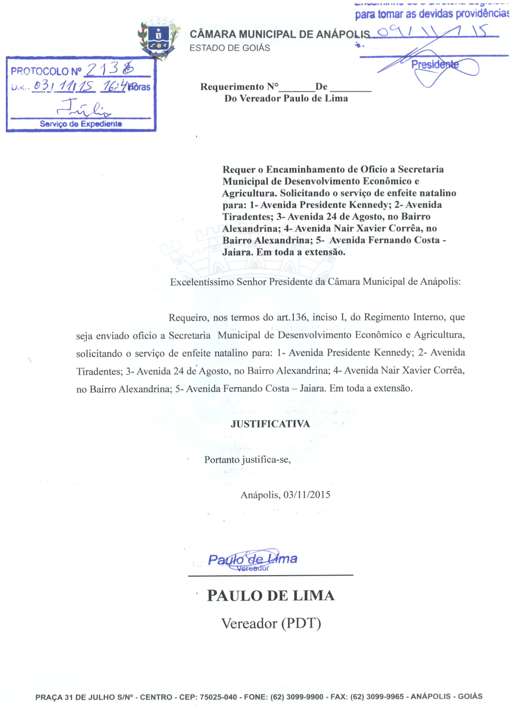 À SECRETARIA MUNICIPAL DE DESENVOLVIMENTO ECONÔMICO E AGRICULTURA, SOLICITANDO O SERVIÇO DE ENFEITE NATALINO PARA: 1- AVENIDA PRESIDENTE KENNEDY; 2- AVENIDA TIRADENTES; 3- AVENIDA 24 DE AGOSTO, NO BAIRRO ALEXANDRINA; 4- AVENIDA NAIR XAVIER CORRÊA, NO BAIRRO ALEXANDRINA; 5- AVENIDA FERNANDO COSTA -JAIARA. EM TODA A EXTENSÃO. EXCELENTÍSSIMO SENHOR PRESIDENTE DA CÂMARA MUNICIPAL DE ANÁPOLIS: REQUEIRO, NOS TERMOS DO ART.136, INCISO I, DO REGIMENTO INTERNO, QUE SEJA ENVIADO OFICIO A SECRETARIA MUNICIPAL DE DESENVOLVIMENTO ECONÔMICO E AGRICULTURA, SOLICITANDO O SERVIÇO DE ENFEITE NATALINO PARA: 1- AVENIDA PRESIDENTE KENNEDY; 2- AVENIDA TIRADENTES; 3- AVENIDA 24 DE AGOSTO, NO BAIRRO ALEXANDRINA; 4- AVENIDA NAIR XAVIER CORRÊA, NO BAIRRO ALEXANDRINA; 5- AVENIDA FERNANDO COSTA — JAIARA. EM TODA A EXTENSÃO.