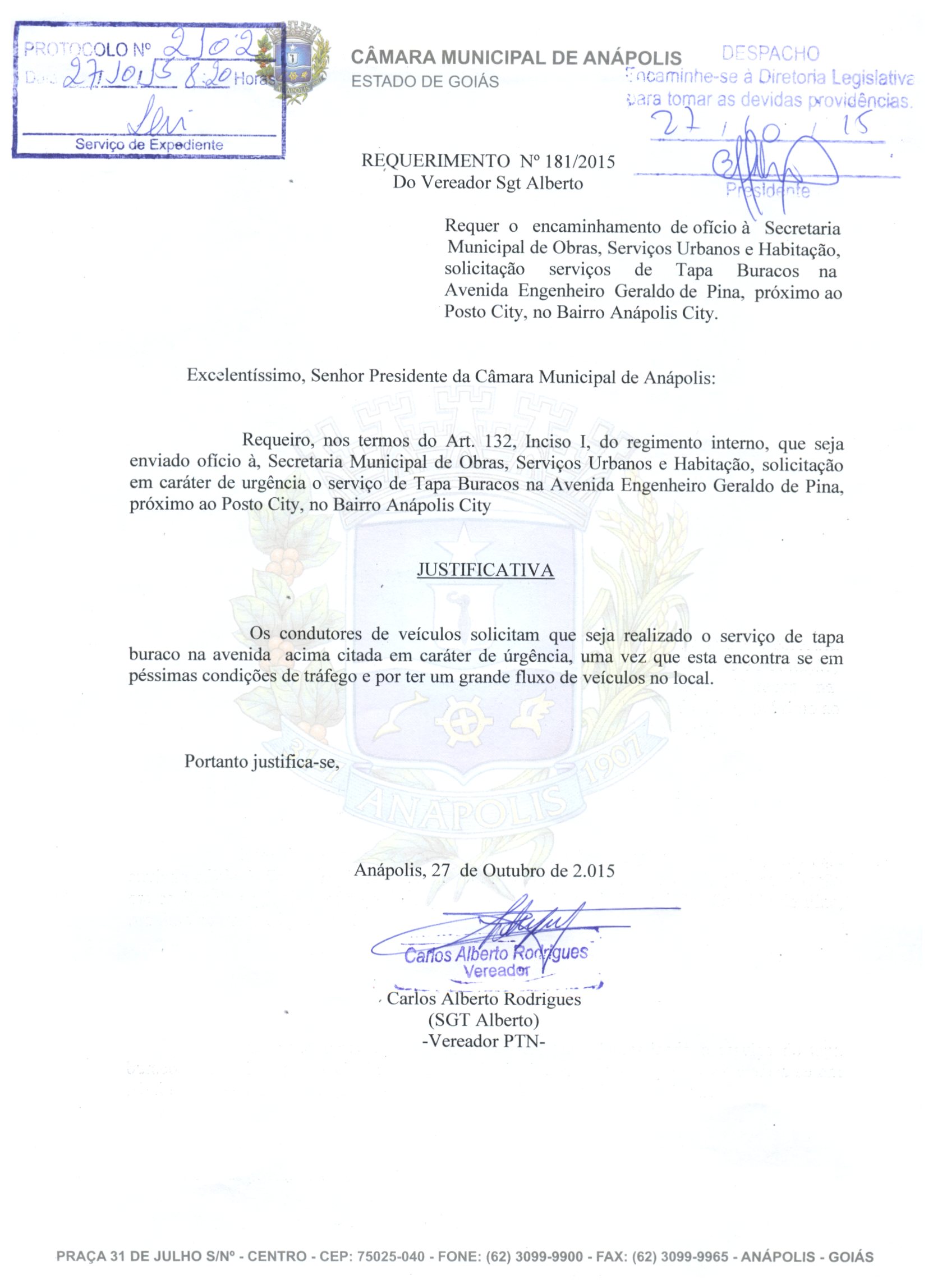 À SECRETARIA MUNICIPAL DE OBRAS, SERVIÇOS URBANOS E HABITAÇÃO, SOLICITAÇÃO EM CARÁTER DE URGÊNCIA O SERVIÇO DE TAPA BURACOS NA AVENIDA ENGENHEIRO GERALDO DE PINA, PRÓXIMO AO POSTO CITY, NO BAIRRO ANÁPOLIS CITY.