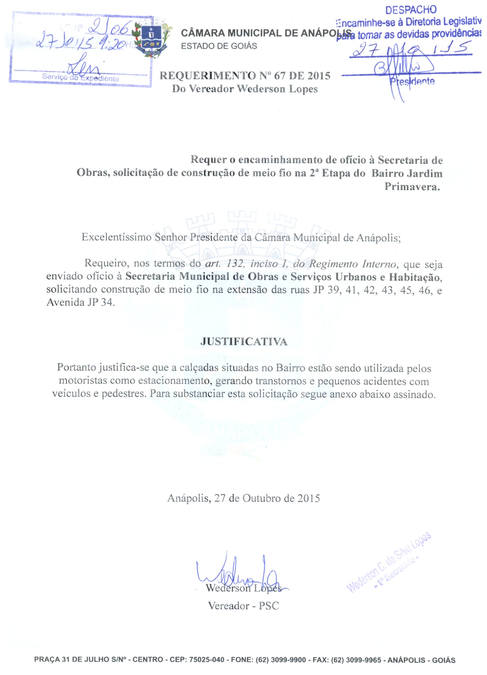 À SECRETARIA MUNICIPAL DE OBRAS E SERVIÇOS URBANOS E HABITAÇÃO, SOLICITANDO CONSTRUÇÃO DE MEIO FIO NA EXTENSÃO DAS RUAS JP 39, 41,42,43,45,46 E AVENIDA JP39 JARDIM DAS PRIMAVERAS.