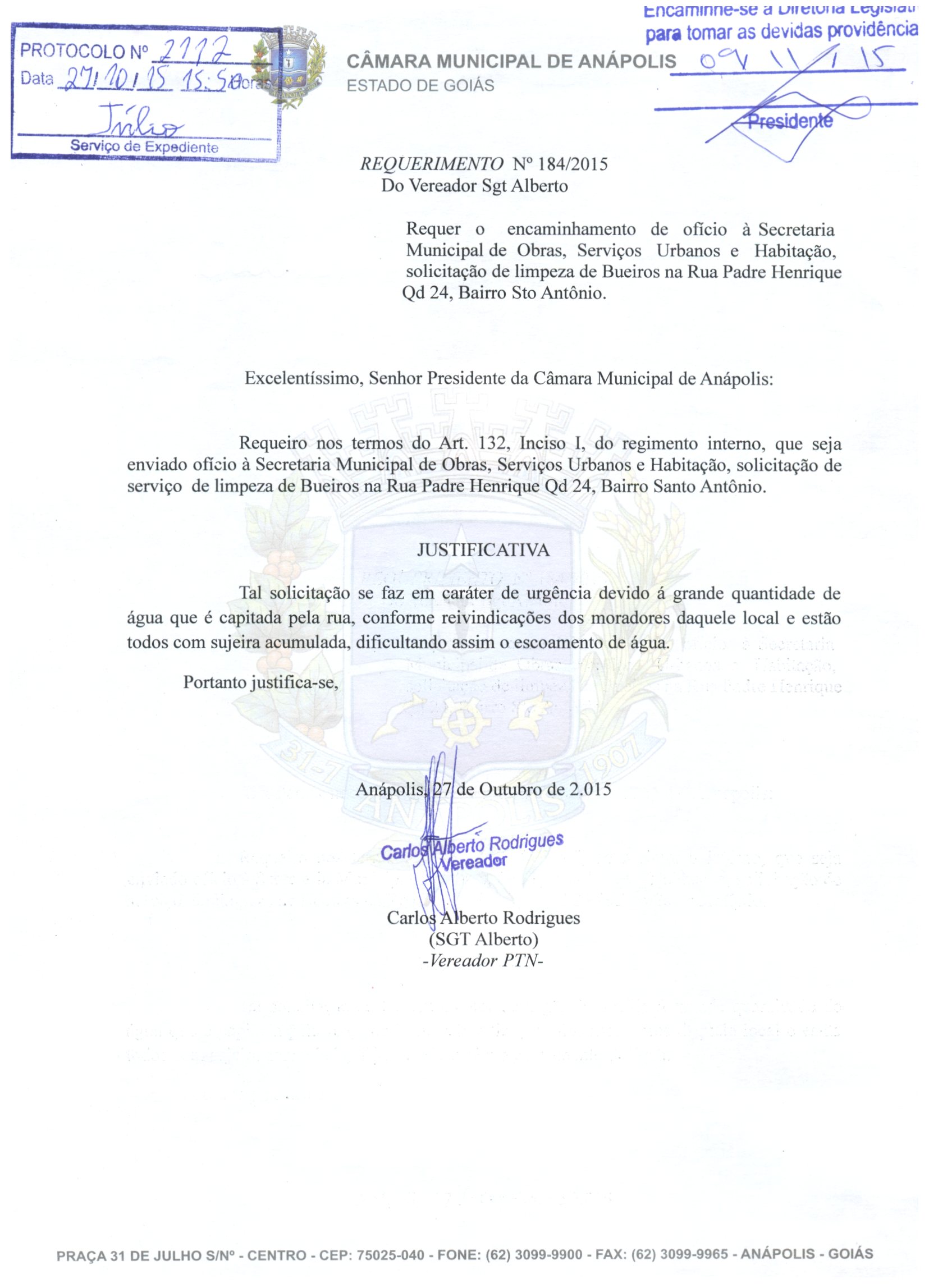 À SECRETARIA MUNICIPAL DE OBRAS, SERVIÇOS URBANOS E HABITAÇÃO, SOLICITAÇÃO DE SERVIÇO DE LIMPEZA DE BUEIROS NA RUA PADRE HENRIQUE, QUADRA 24, BAIRRO SANTO ANTÔNIO.