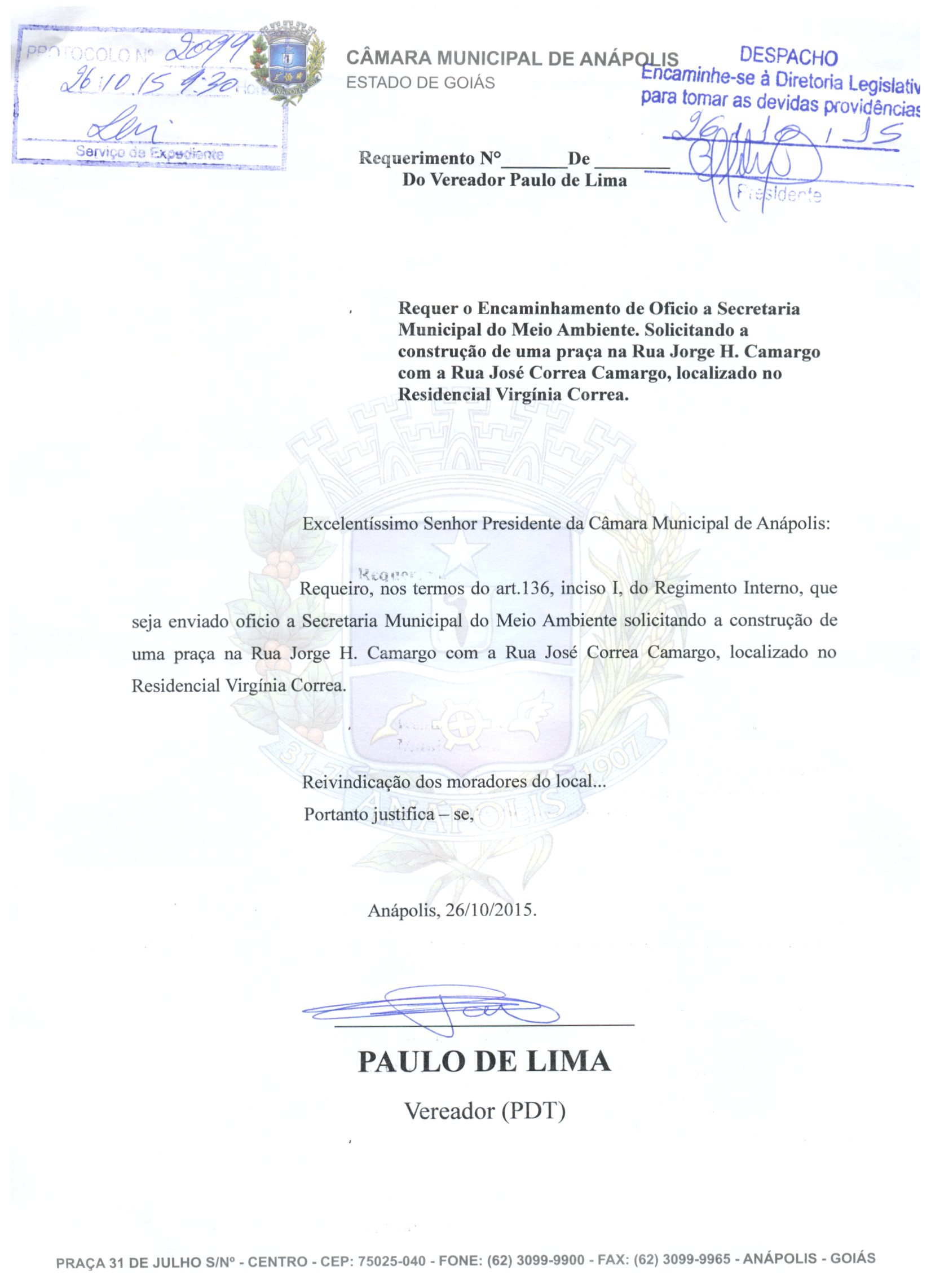 QUE SEJA ENVIADO OFÍCIO A SECRETARIA MUNICIPAL DE MEIO AMBIENTE, SOLICITANDO A CONSTRUÇÃO DE UMA PRAÇA NA RUA JORGE H. CAMARGO COM A RUA JOSÉ CORREA CAMARGO, LOCALIZADO NO RESIDENCIAL VIRGÍNIA CORREA.