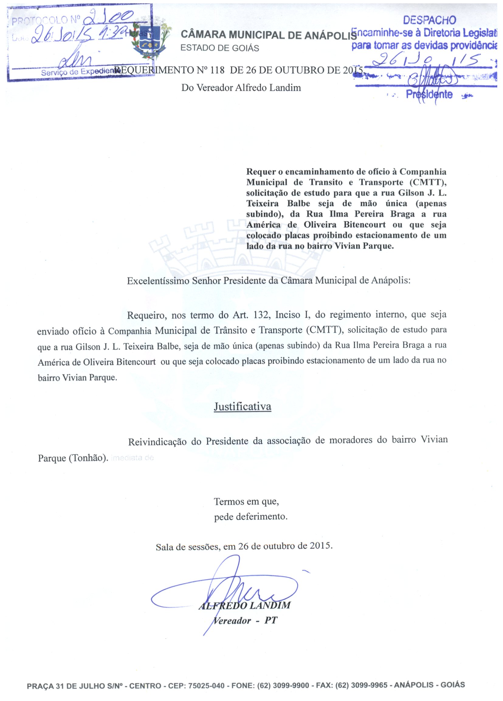 À COMPANHIA MUNICIPAL DE TRÂNSITO E TRANSPORTE (CMTT), SOLICITAÇÃO DE ESTUDO PARA QUE A RUA GILSON J. L. TEIXEIRA BALBE, SEJA DE MÃO ÚNICA (APENAS SUBINDO) DA RUA ILMA PEREIRA BRAGA A RUA AMÉRICA DE OLIVEIRA BITENCOURT OU QUE SEJA COLOCADO PLACAS PROIBINDO ESTACIONAMENTO DE UM LADO DA RUA NO BAIRRO VIVIAN PARQUE.