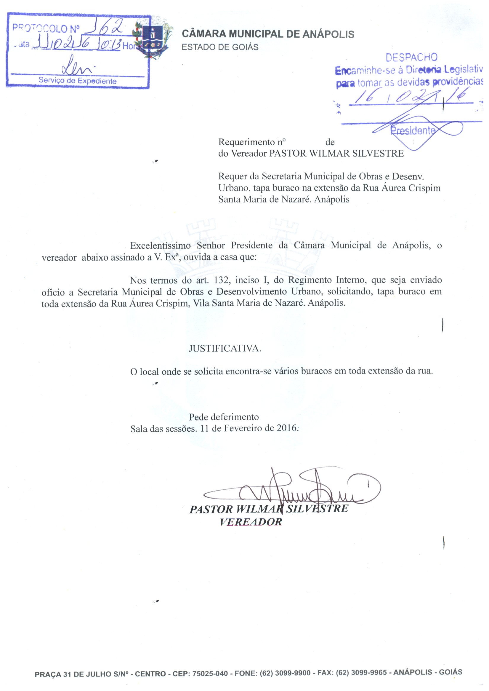 À SECRETARIA DE OBRAS, SERVIÇOS URBANOS E HABITAÇÃO. SOLICITANDO SERVIÇO DE TAPA BURACO NA EXTENSÃO DA RUA ÁUREA CRISPIM.