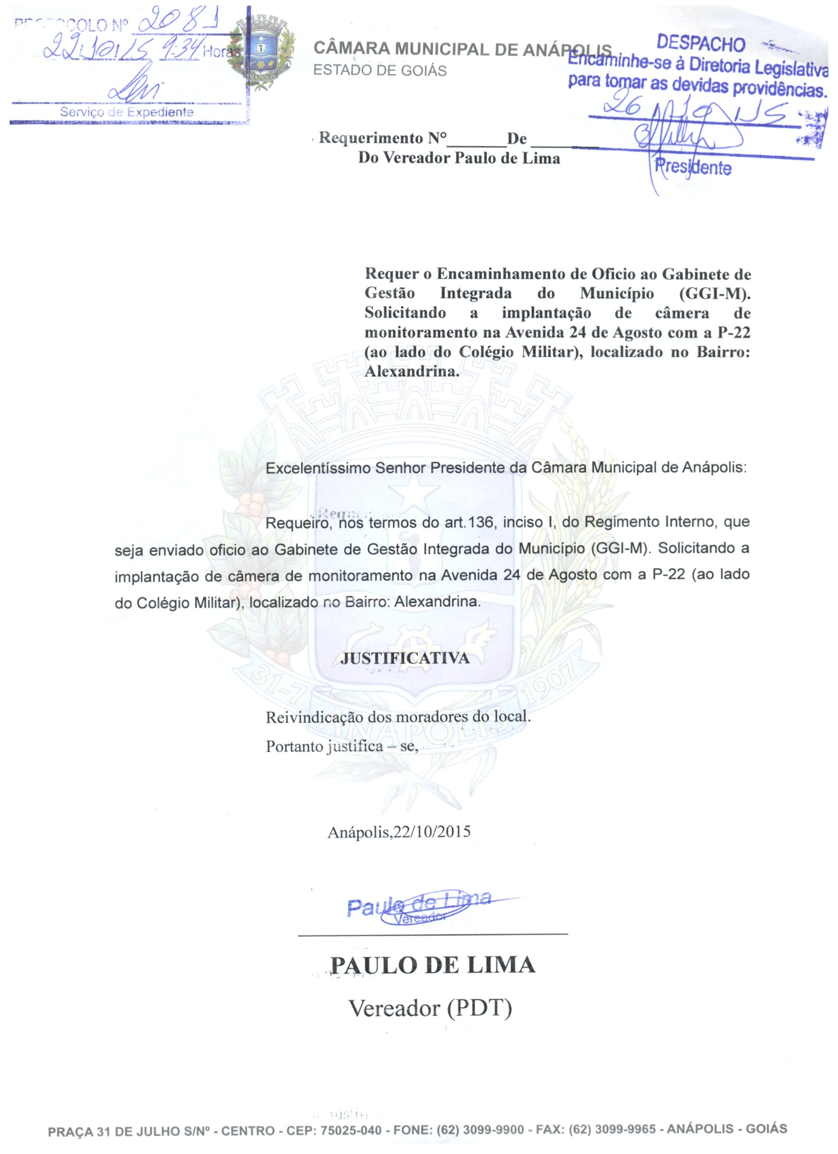 QUE SEJA ENVIADO OFÍCIO AO GABINETE DE GESTÃO INTEGRADA DO MUNICIPIO (GGI-M). SOLICITANDO A IMPLANTAÇÃO DE CÂMERA DE MONITORAMENTO NA AVENIDA 24 DE AGOSTO COM A P-22 (AO LADO DO COLÉGIO MILITAR) LOCALIZADO NO BAIRRO ALEXANDRINA.
