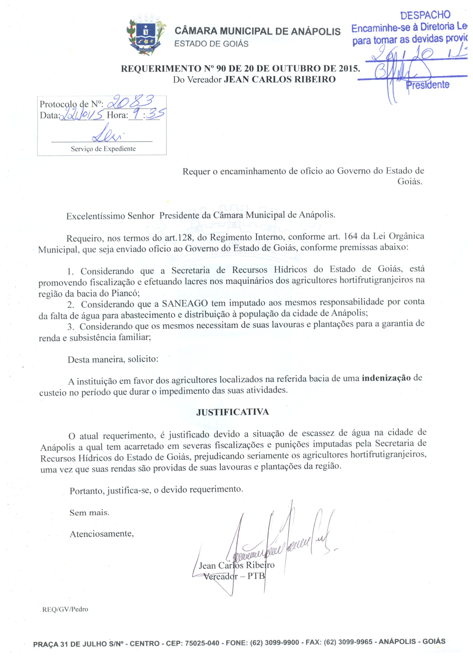 QUE SEJA ENVIADO OFÍCIO AO GOVERNO DO ESTADO DE GOIÁS, CONFORME PREMISSAS ABAIXO: 1. CONSIDERANDO QUE A SECRETARIA DE RECURSOS HÍDRICOS DO ESTADO DE GOIÁS, ESTÁ PROMOVENDO FISCALIZAÇÃO E EFETUANDO LACRES NOS MAQUINÁRIOS DOS AGRICULTORES HORTIFRUTIGRANJEIROS NA REGIÃO DA BACIA DO PIANCÓ; 2. CONSIDERANDO QUE A SANEAGO TEM IMPUTADO AOS MESMOS RESPONSABILIDADE POR CONTA DA FALTA DE ÁGUA PARA ABASTECIMENTO E DISTRIBUIÇÃO À POPULAÇÃO DA CIDADE DE ANÁPOLIS; 3. CONSIDERANDO QUE OS MESMOS NECESSITAM DE SUAS LAVOURAS E PLANTAÇÕES PARA A GARANTIA DE RENDA E SUBSISTÊNCIA FAMILIAR; DESTA MANEIRA, SOLICITO: A INSTITUIÇÃO EM FAVOR DOS AGRICULTORES LOCALIZADOS NA REFERIDA BACIA DE UMA INDENIZAÇÃO DE CUSTEIO NO PERÍODO QUE DURAR O IMPEDIMENTO DAS SUAS ATIVIDADES.