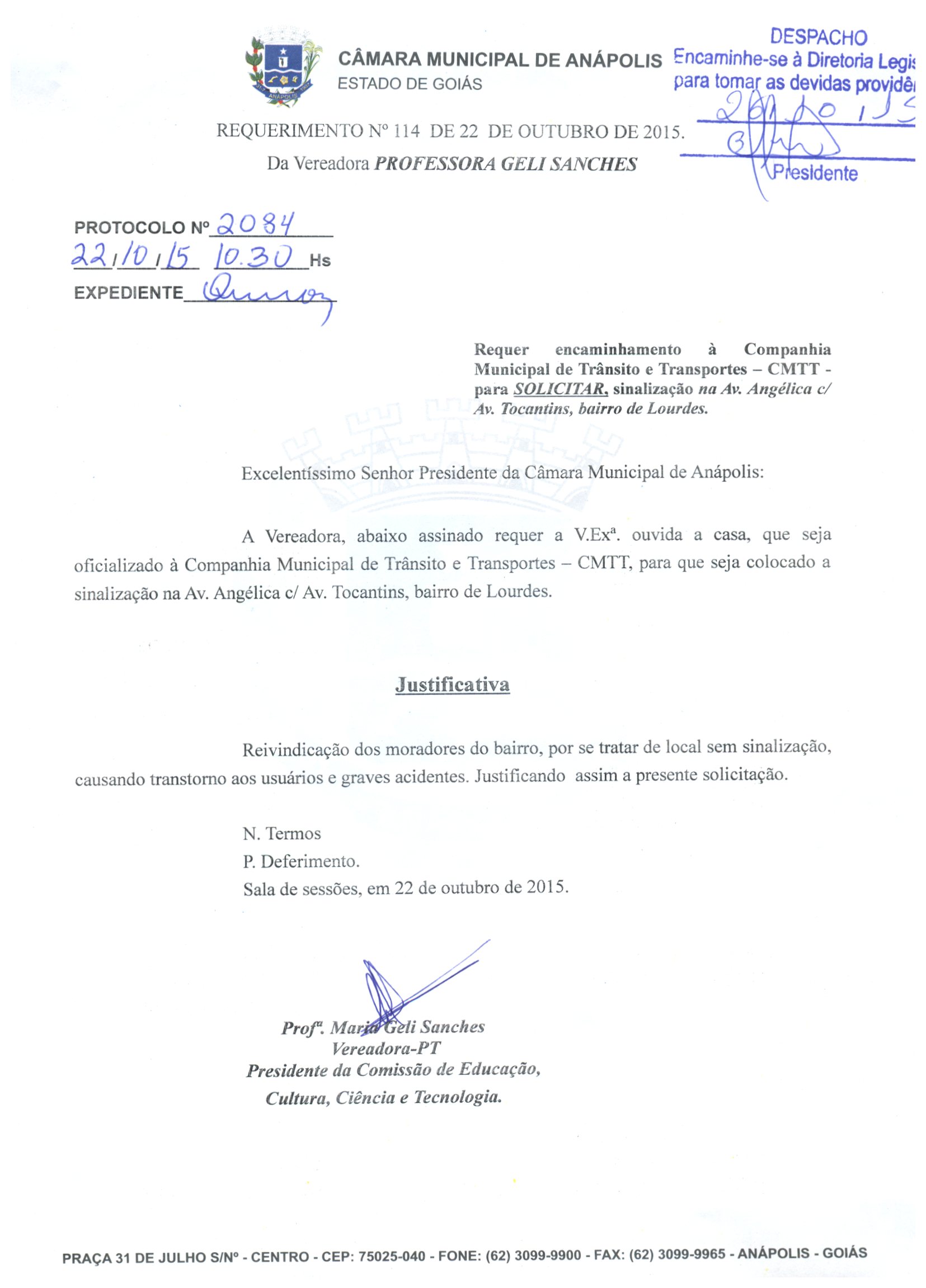 À COMPANHIA MUNICIPAL DE TRÂNSITO E TRANSPORTES CMTT - PARA QUE SEJA COLOCADO A SINALIZAÇÃO NA AVENIDA ANGÉLICA COM AVENIDA TOCANTINS, BAIRRO DE LOURDES.