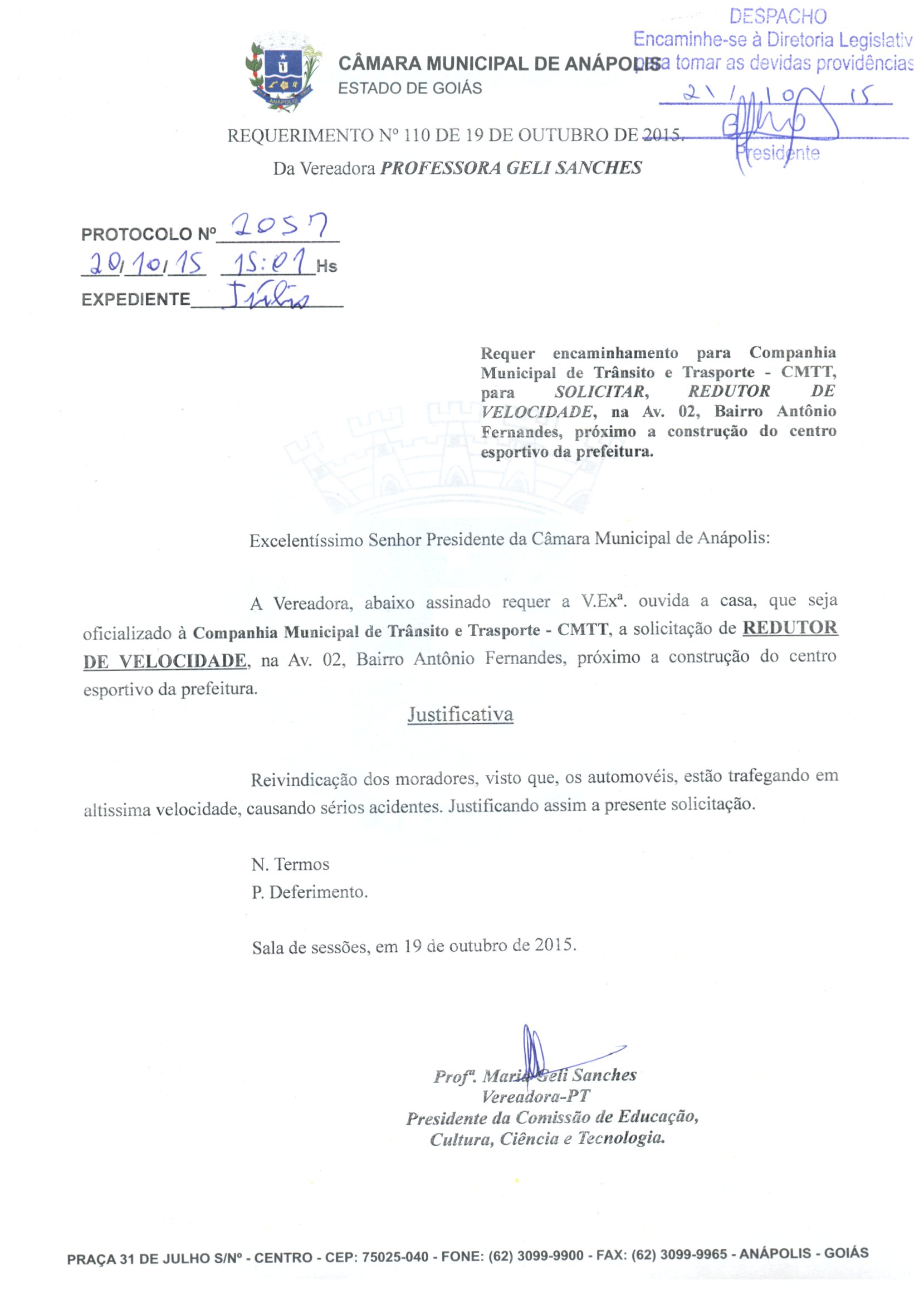 AO CMTT -SOLICITANDO COLOCAÇÃO DE REDUTOR DE VELOCIDADE NA AV. 02 B. ANTÔNIO FERNANDES PRÓXIMO A CONSTRUÇÃO DO CENTRO ESPORTIVO DA PREFEITURA.