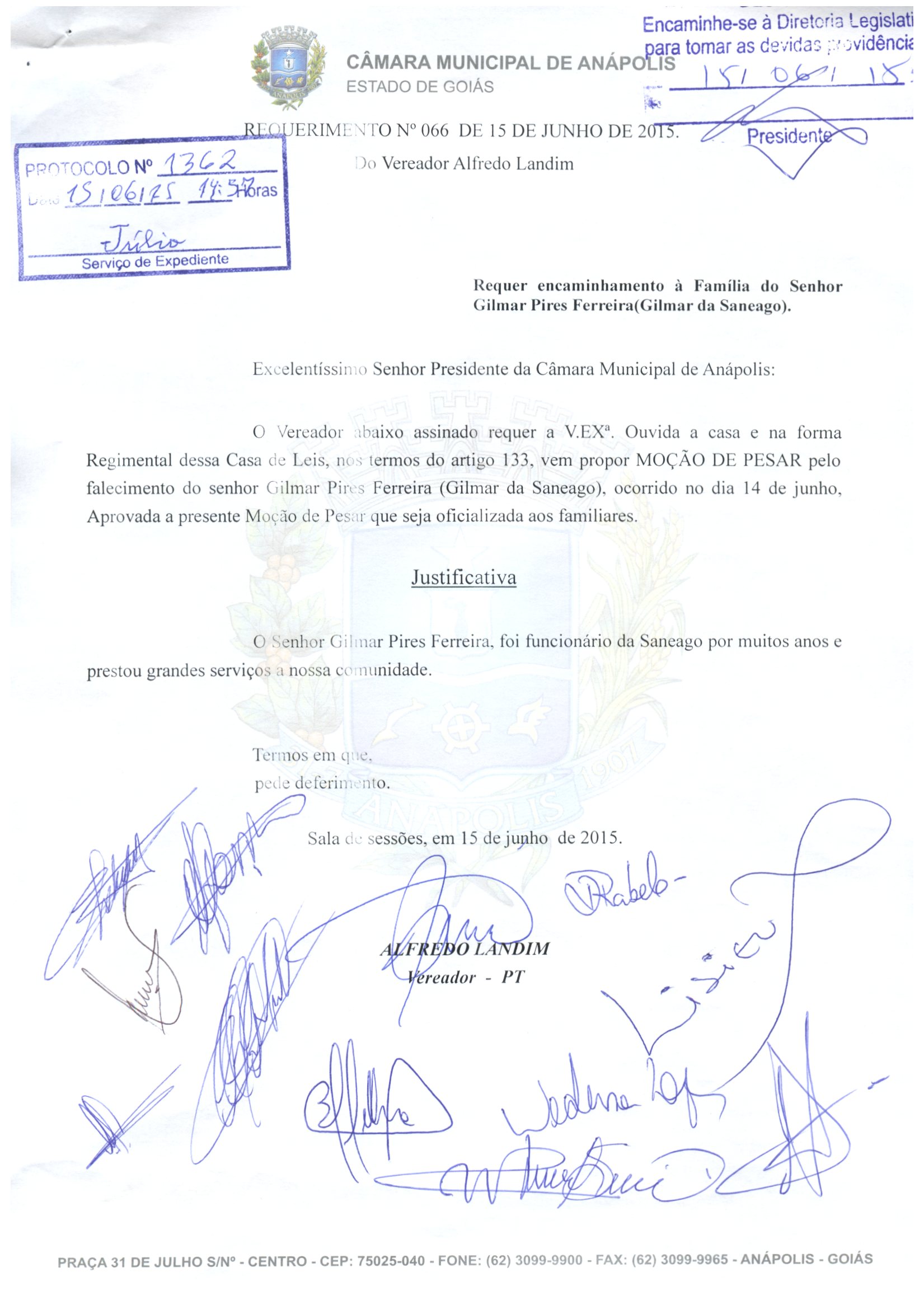 MOÇÃO DE PESAR PELO FALECIMENTO DO SENHOR GILMAR PIRES FERREIRA (GILMAR DA SANEAGO), OCORRIDO NO DIA 14 DE JUNHO, APROVADA A PRESENTE MOÇÃO DE PESAR QUE SEJA OFICIALIZADA AOS FAMILIARES.