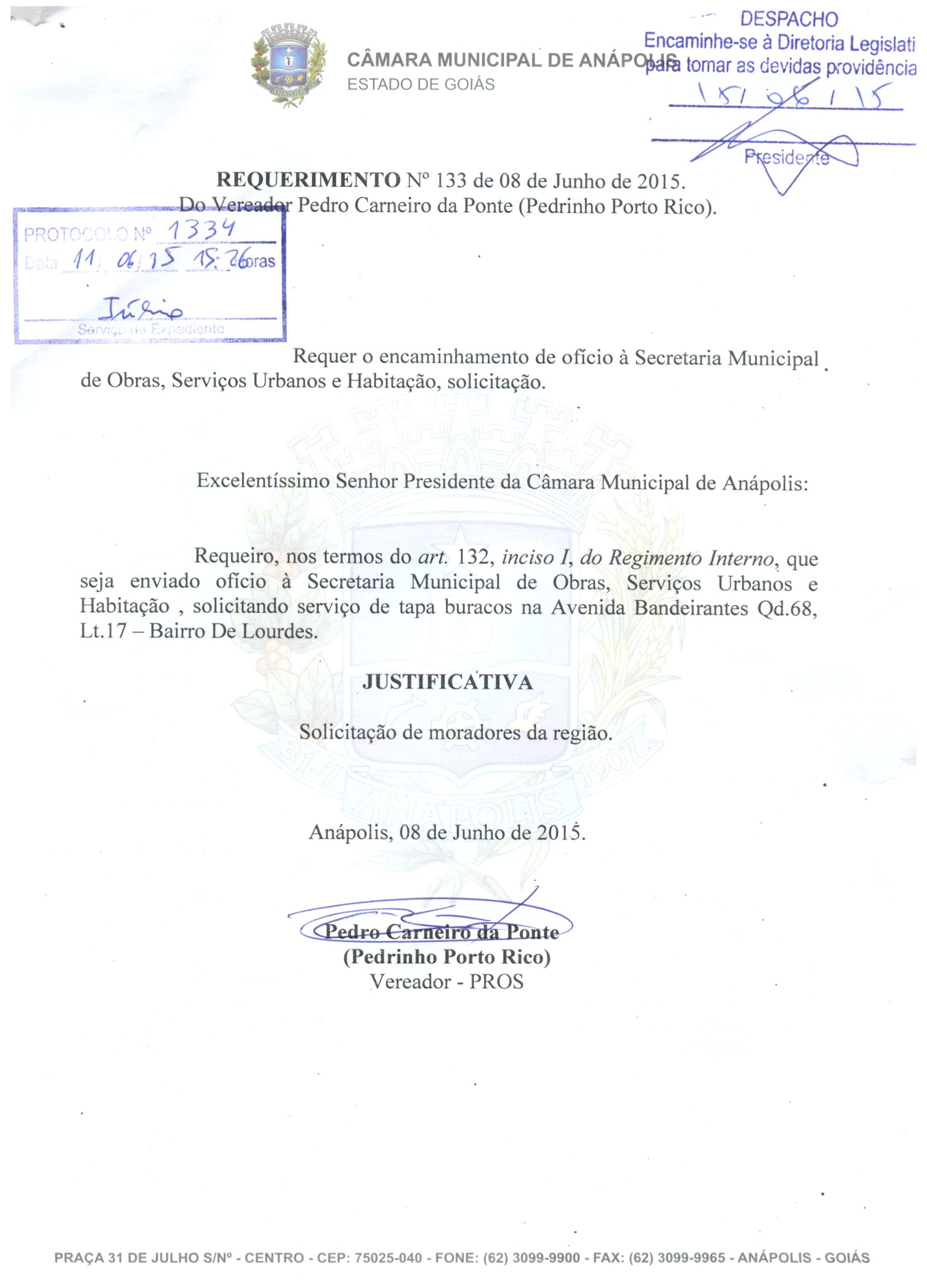 À SECRETARIA MUNICIPAL DE OBRAS, SERVIÇOS URBANOS E HABITAÇÃO, SOLICITANDO SERVIÇOS DE TAPA BURACOS NA AVENIDA BANDEIRANTES, QUADRAS 68, LOTE 17, BAIRRO DE LOURDES.