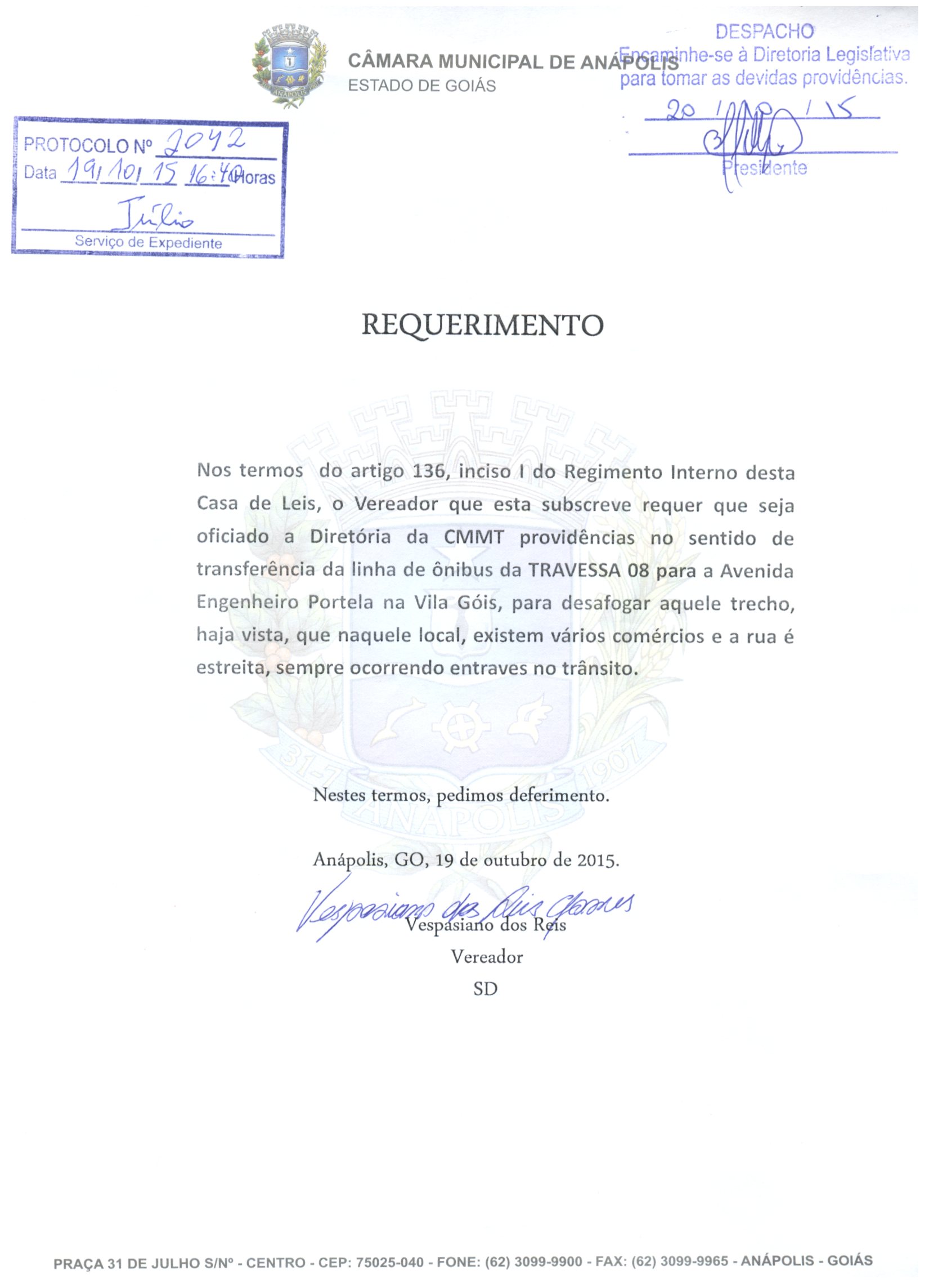 QUE SEJA OFICIADO A DIRETORIA DA CMTT PROVIDÊNCIAS NO SENTIDO DE TRANSFERÊNCIA DA LINHA DE ÔNIBUS DA TRAVESSA 08, PARA A AVENIDA ENGENHEIRO PORTELA NA VILA GÓIS, PARA DESAFOGAR AQUELE TRECHO, HAJA VISTA, QUE NAQUELE LOCAL, EXISTEM VÁRIOS COMÉRCIOS E A RUA É ESTREITA, SEMPRE OCORRENDO ENTRAVES NO TRÂNSITO.