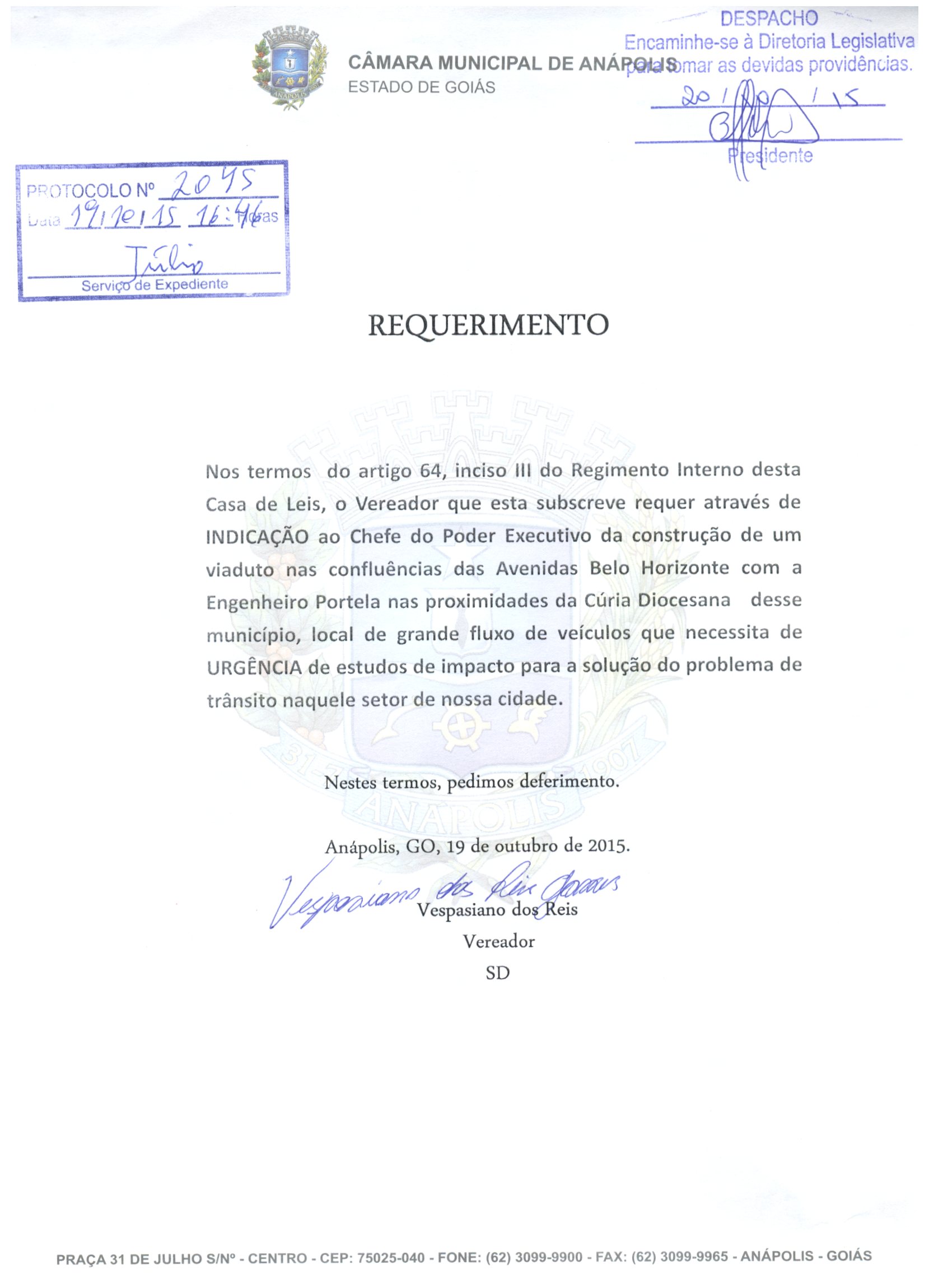 O VEREADOR QUE ESTA SUBSCREVE REQUER ATRAVÉS DE INDICAÇÃO AO CHEFE DO PODER EXECUTIVO DA CONSTRUÇÃO DE UM VIADUTO NAS CONFLUÊNCIAS DAS AVENIDAS BELO HORIZONTE COM A ENGENHEIRO PORTELA NAS PROXIMIDADES DA CÚRIA DIOCESANA DESSE MUNICÍPIO, LOCAL DE GRANDE FLUXO DE VEÍCULOS QUE NECESSITA DE URGÊNCIA DE ESTUDOS DE IMPACTO PARA A SOLUÇÃO DO PROBLEMA DE TRÂNSITO NAQUELE SETOR DE NOSSA CIDADE.