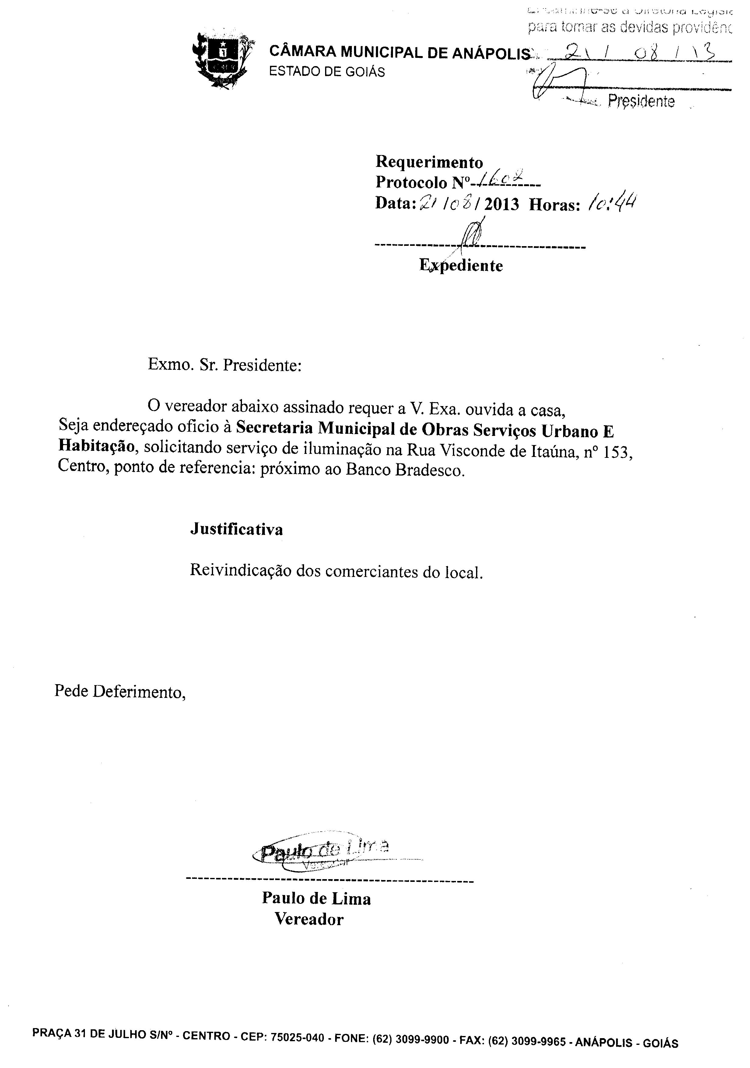 À SECRETARIA MUNICIPAL DE OBRAS SERVIÇOS URBANOS E HABITAÇÃO, SOLICITANDO SERVIÇO DE ILUMINAÇÃO NA RUA VISCONDE DE ITAÚNA, N° 153, CENTRO, PONTO DE REFERENCIA: PRÓXIMO AO BANCO BRADESCO.