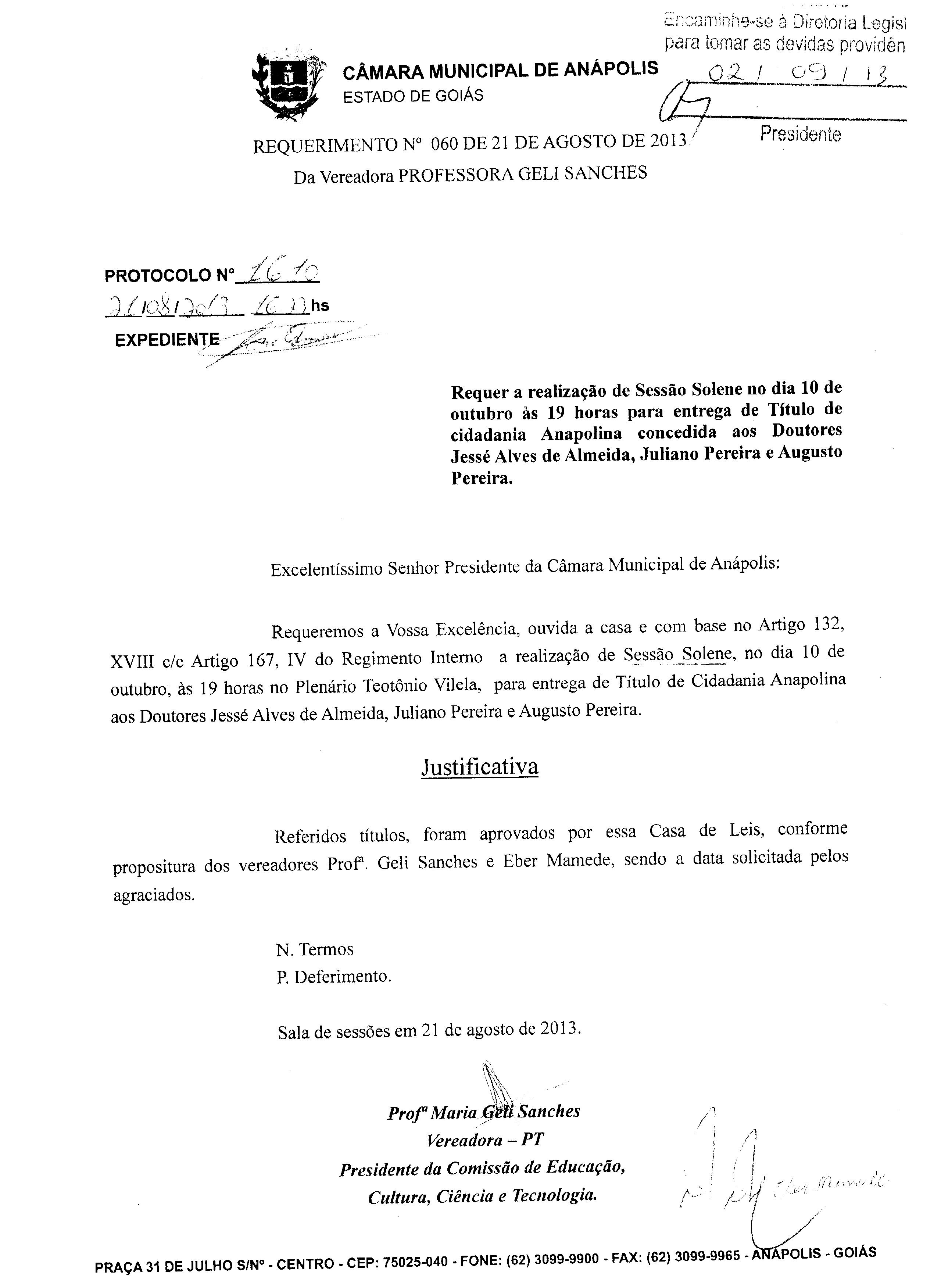 À REALIZAÇÃO DE SESSÃO SOLENE, NO DIA 10 DE OUTUBRO, ÀS 19 HORAS NO PLENÁRIO TEOTÔNIO VILELA, PARA ENTREGA DE TÍTULO DE CIDADANIA ANAPOLINA AOS DOUTORES JESSÉ ALVES DE ALMEIDA, JULIANO PEREIRA E AUGUSTO PEREIRA.