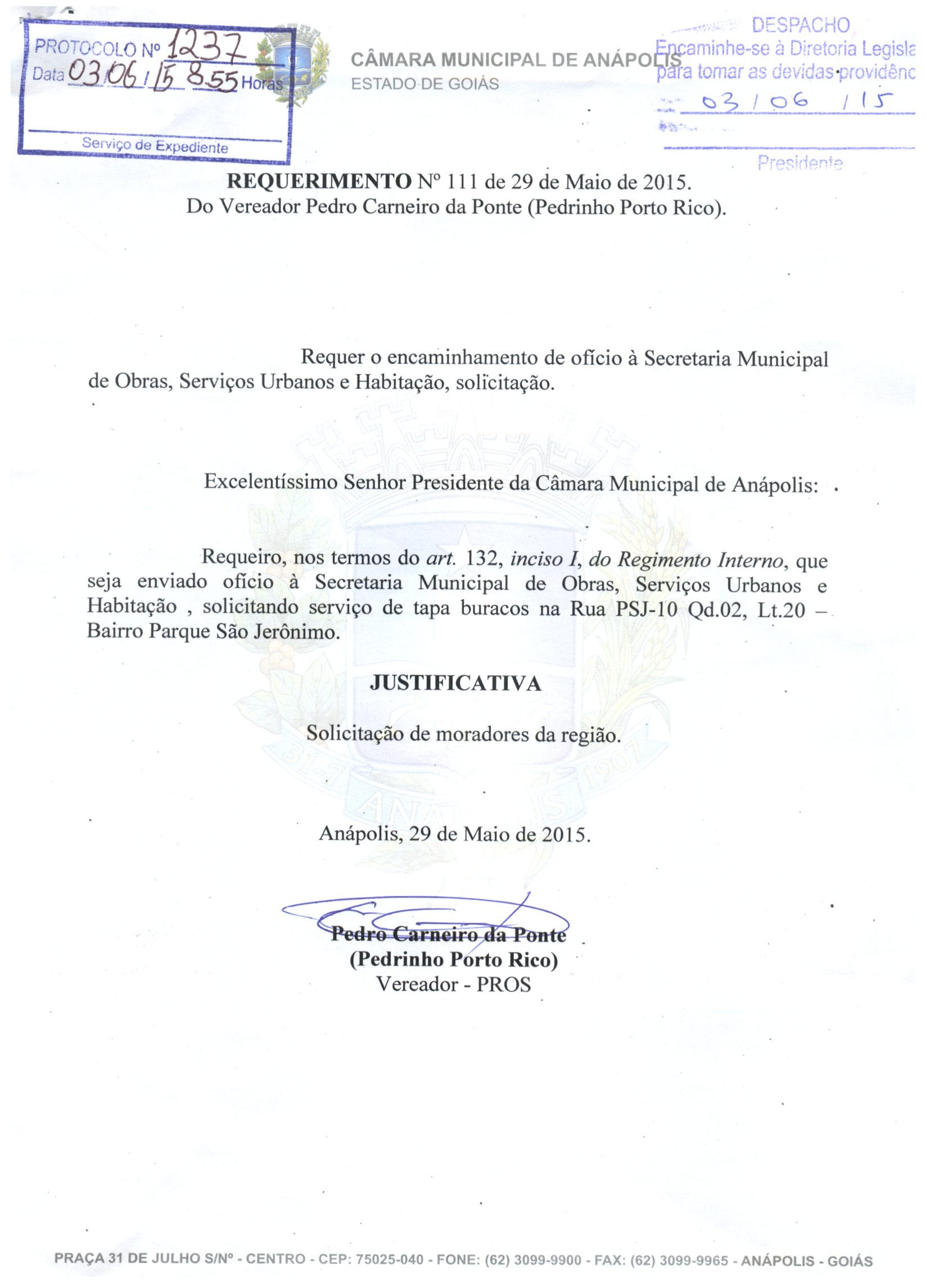 À SECRETARIA MUNICIPAL DE OBRAS, SERVIÇOS URBANOS E HABITAÇÃO, SOLICITANDO SERVIÇO DE TAPA BURACOS NA RUA PSJ-10, QUADRA 02, LOTE 20, BAIRRO SÃO JERÔNIMO.