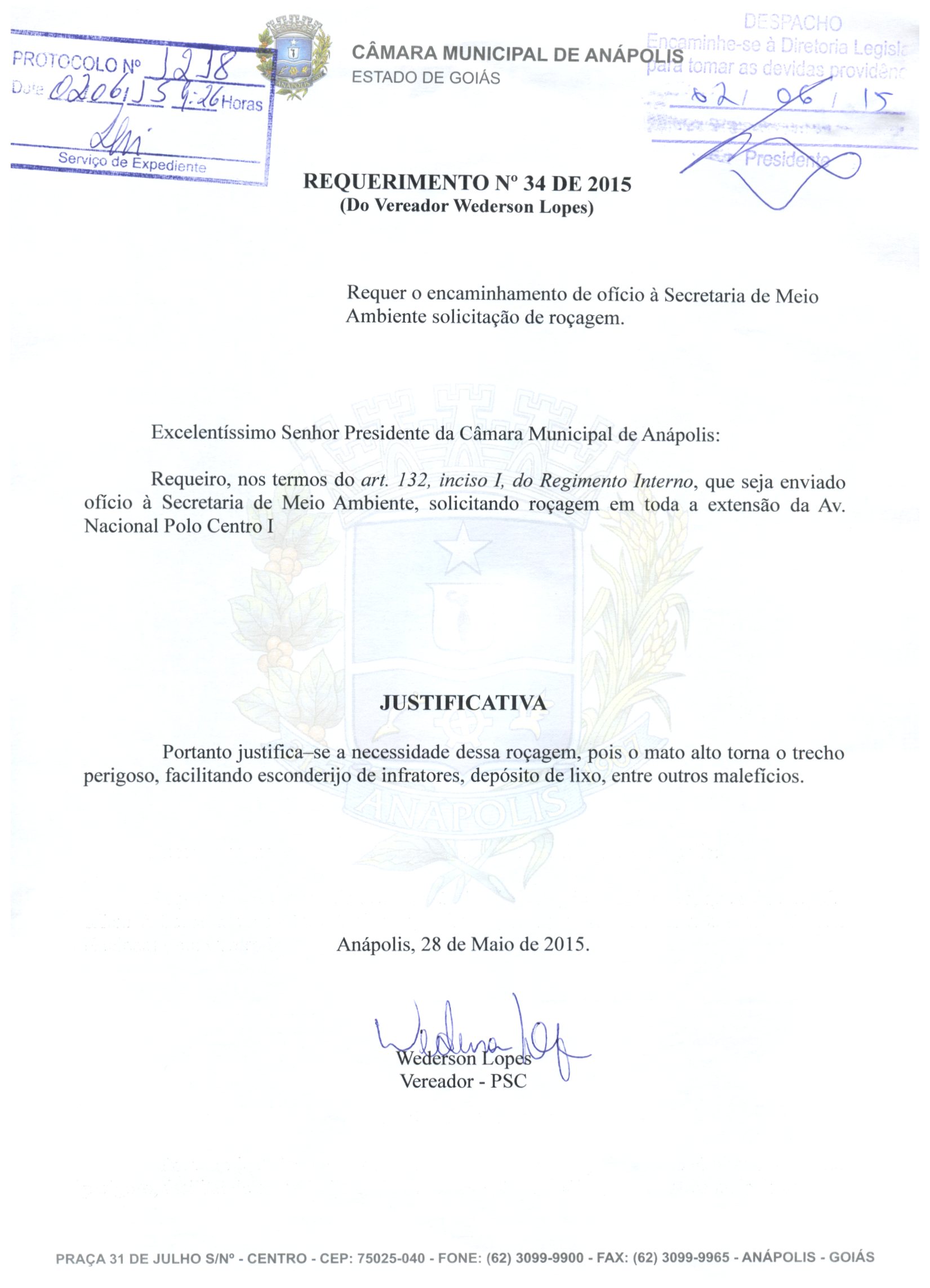 À SECRETARIA MUNICIPAL DE MEIO AMBIENTE, SOLICITANDO ROÇAGEM EM TODA A EXTENSÃO DA AVENIDA NACIONAL POLO CENTRO I.