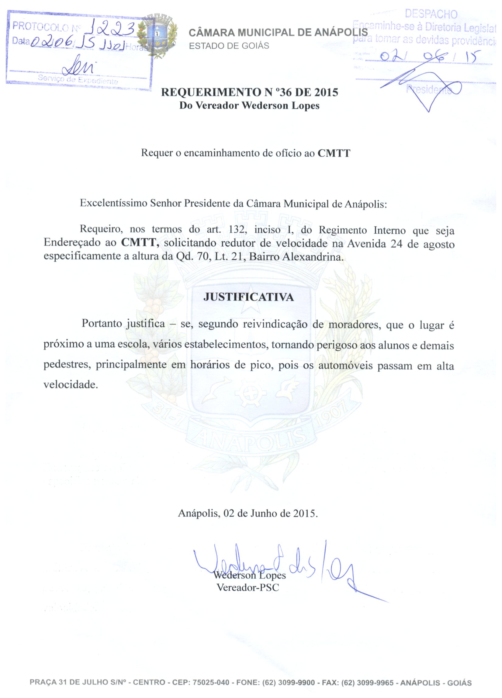QUE SEJA ENDEREÇADO AO CMTT, SOLICITANDO REDUTOR DE VELOCIDADE NA AVENIDA 24 DE AGOSTO ESPECIFICAMENTE A ALTURA DA QUADRA 70, LOTE 21, BAIRRO ALEXANDRINA.