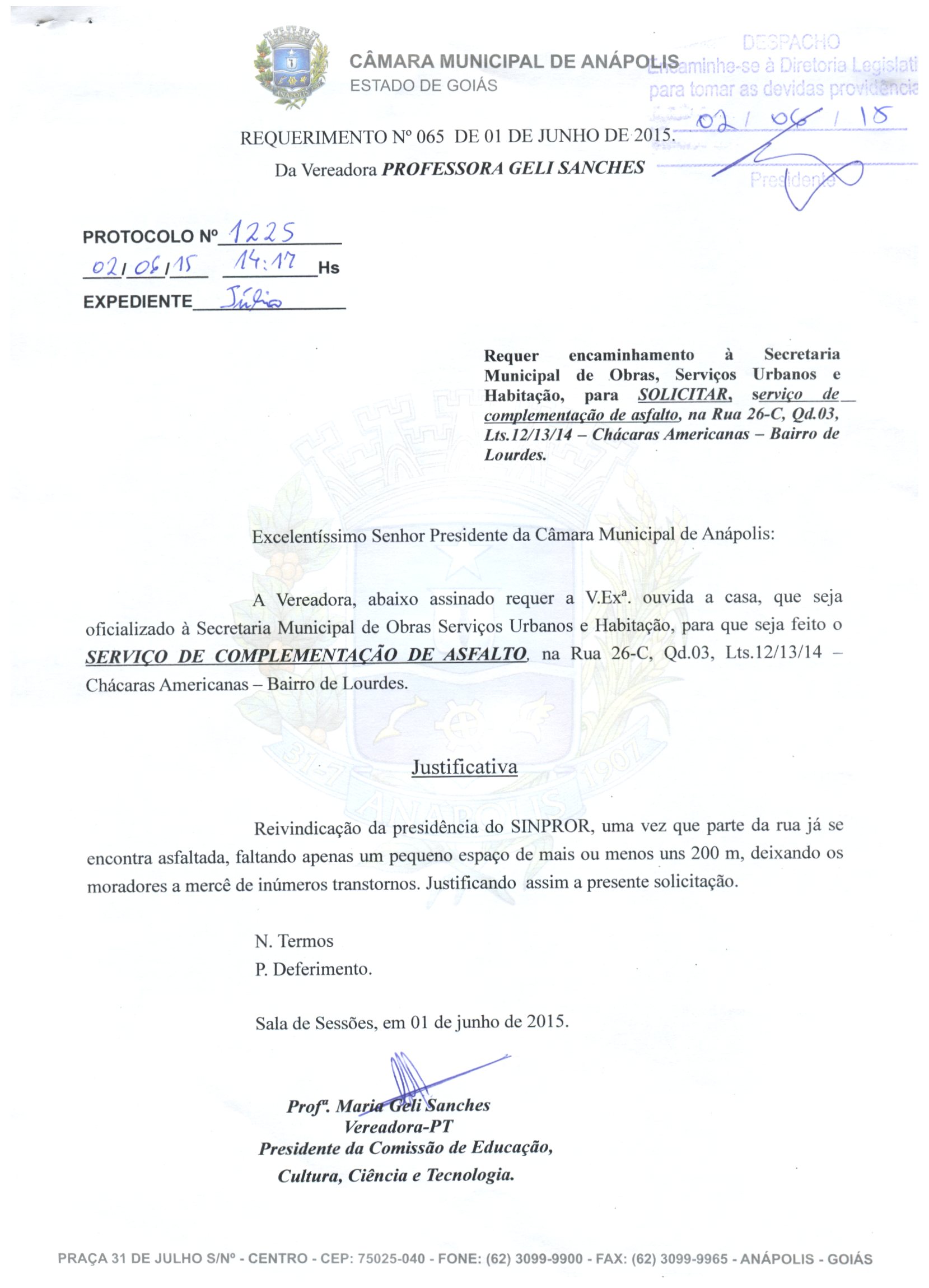 À SECRETARIA MUNICIPAL DE OBRAS, SERVIÇOS URBANOS E HABITAÇÃO, PARA QUE SEJA FEITO O SERVIÇO DE COMPLEMENTAÇÃO DE ASFALTO, NA RUA 26-C, QUADRA 03, LOTES 12/13/14, CHÁCARAS AMERICANAS, BAIRRO DE LOURDES.