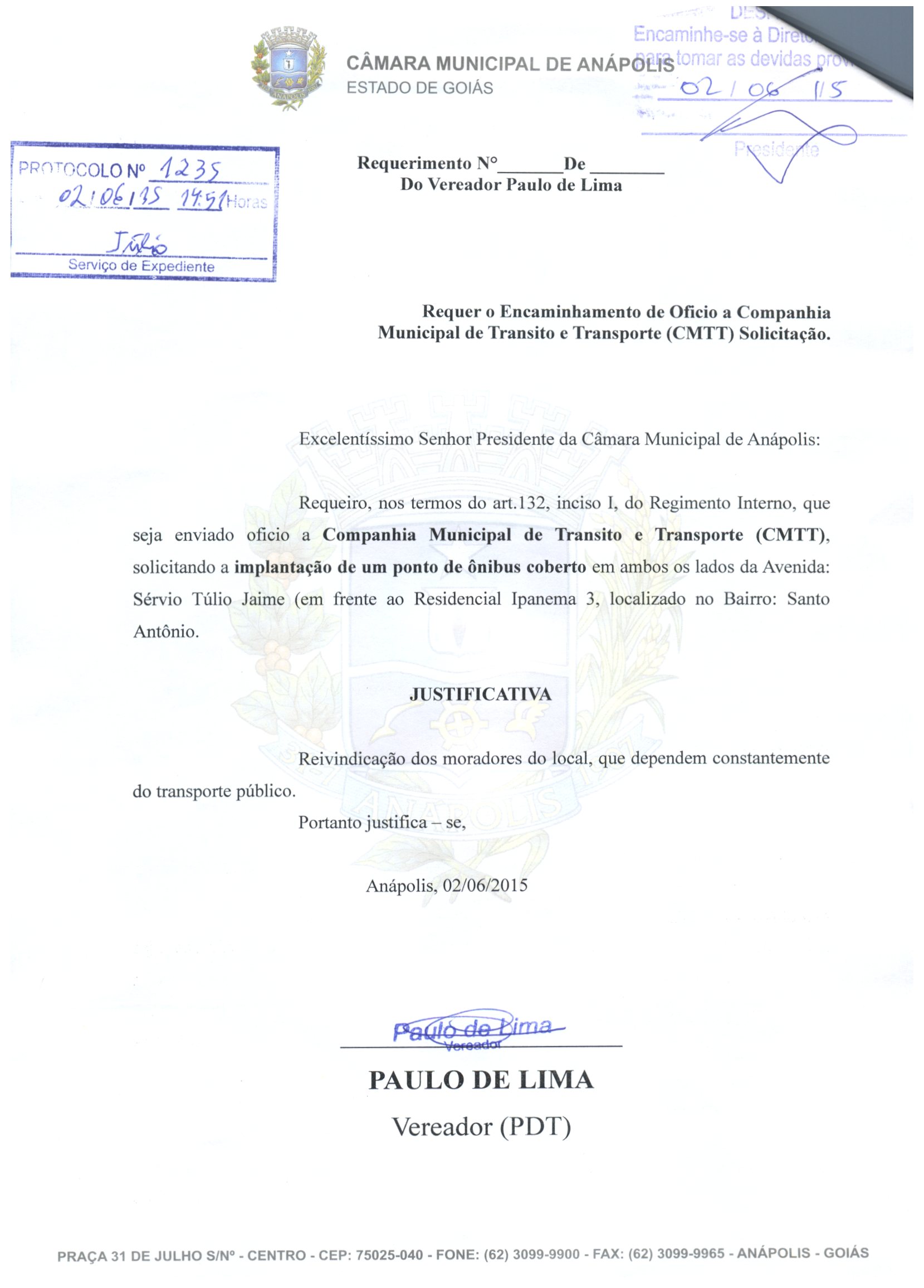À COMPANHIA MUNICIPAL DE TRÂNSITO E TRANSPORTE (CMTT), SOLICITANDO A IMPLANTAÇÃO DE UM PONTO DE ÔNIBUS COBERTO EM AMBOS OS LADOS DA AVENIDA: SÉRVIO TÚLIO JAIME EM FRENTE AO RESIDENCIAL IPANEMA 3, LOCALIZADO NO BAIRRO SANTO ANTÔNIO.