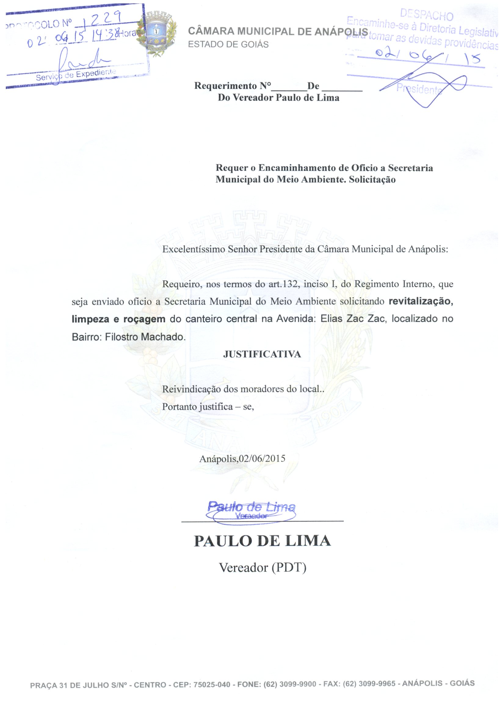 À SECRETARIA MUNICIPAL DE MEIO AMBIENTE SOLICITANDO REVITALIZAÇÃO, LIMPEZA E ROÇAGEM DO CANTEIRO CENTRAL NA AVENIDA ELIAS ZAC ZAC, LOCALIZADO NO BAIRRO FILOSTRO MACHADO.
