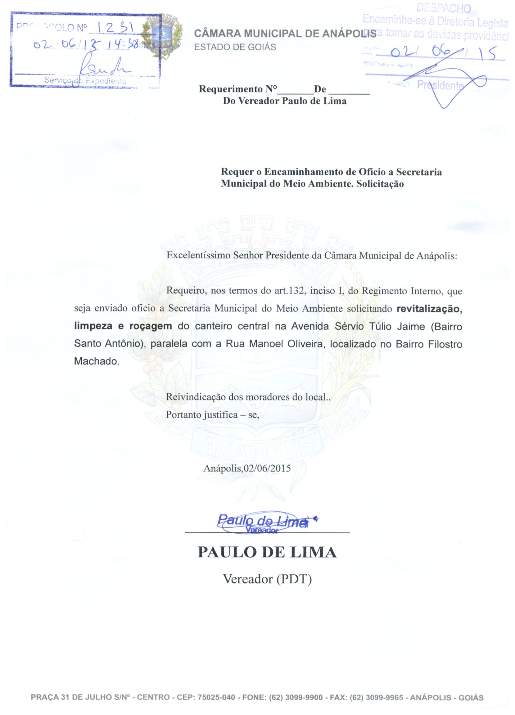À SECRETARIA MUNICIPAL DE MEIO AMBIENTE SOLICITANDO REVITALIZAÇÃO, LIMPEZA E ROÇAGEM DO CANTEIRO CENTRAL NA AVENIDA SÉRVIO TÚLIO JAIME (RESIDENCIAL SANTO ANTÔNIO) PARALELA COM A RUA MANOEL OLIVEIRA NO BAIRRO FILOSTRO MACHADO.