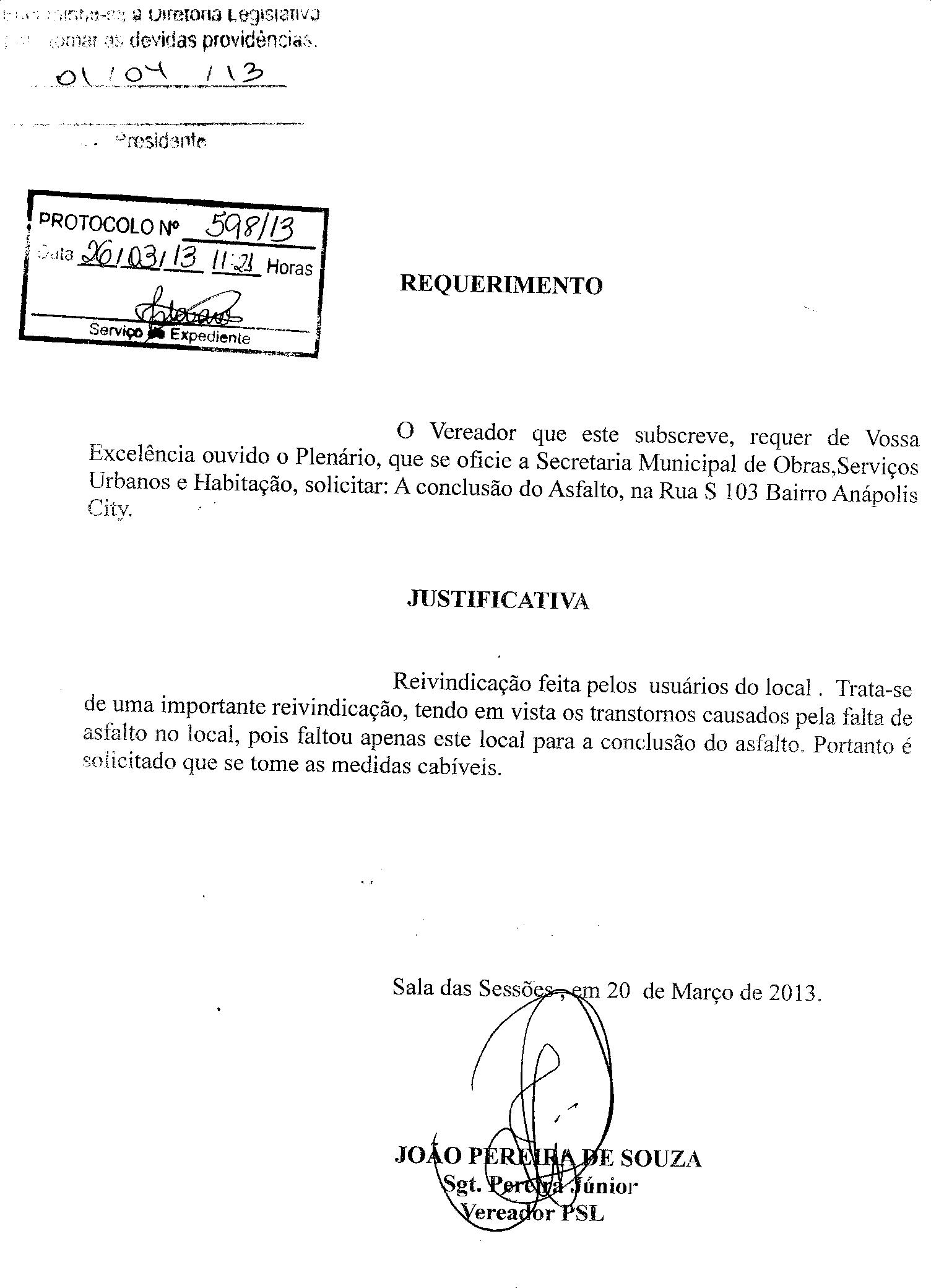 À SECRETARIA MUNICIPAL DE OBRAS, SERVIÇOS URBANOS E HABITAÇÃO, SOLICITAR: A CONCLUSÃO DO ASFALTO, NA RUA S 103 BAIRRO ANÁPOLIS CITY.