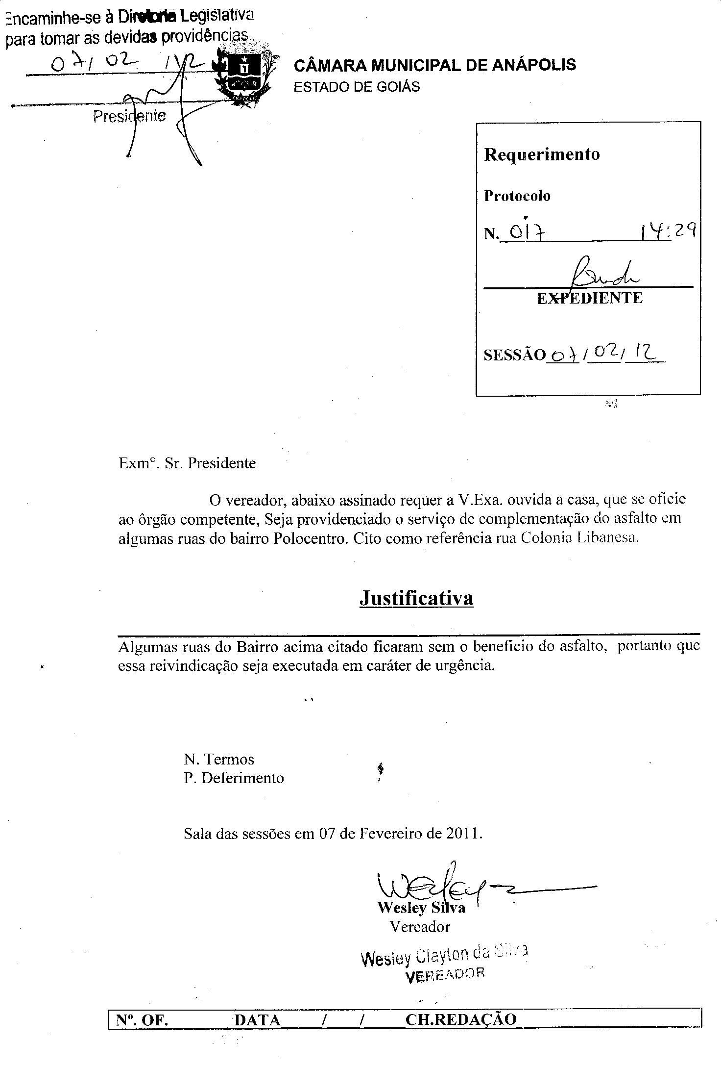 O VEREADOR ABAIXO ASSINADO REQUER A V.EXª. OUVIDA A CASA, QUE SE OFICIE AO ORGÃO COMPETENTE, SEJA PROVIDENCIADO O SERVIÇO DDE COMPLEMENTAÇÃO DO ASFALTO EM ALGUMAS RUAS DO BAIRRO POLOCENTRO . CITO COMO REFERÊNCIA A RUA COLÔNIA LIBANESA.