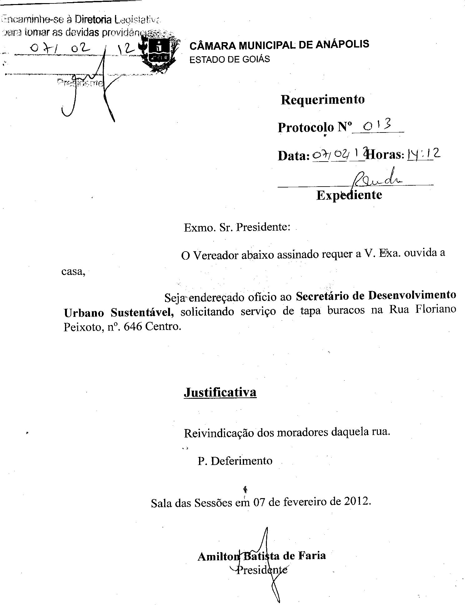 O VEREADOR ABAIXO ASSINADO REQUER A V.EXA.OUVIDA A CASA, SEJA ENDEREÇADO OFÍCIO AO SECRETÁRIO DE DESENVOLVIMENTO URBANO SUSTENTÁVEL, SOLICITANDO SERVIÇO DE TAPA BURACOS NA RUA FLORIANO PEIXOTO, Nº646 CENTRO.