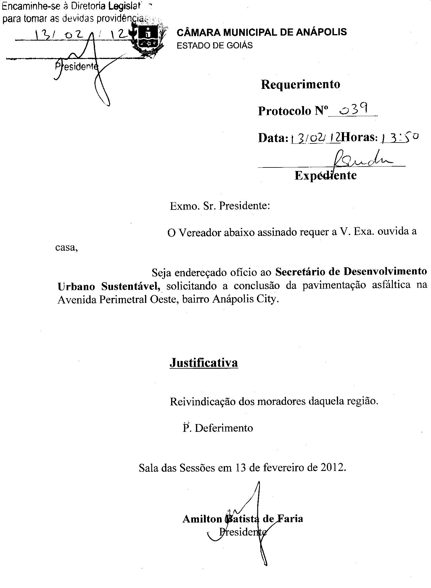 O VEREADOR ABAIXO ASSINADO REQUER A V. EXA. OUVIDA A CASA, SEJA ENDEREÇADO OFÍCIO AO SECRETÁRIO DE DESENVOLVIMENTO URBANO SUSTENTÁVEL, SOLICITANDO A CONCLUSÃO DA PAVIMENTAÇÃO ASFÁTICA NA AVENIDA PERIMETRAL OESTE, BAIRRO ANÁPOLIS CITY.