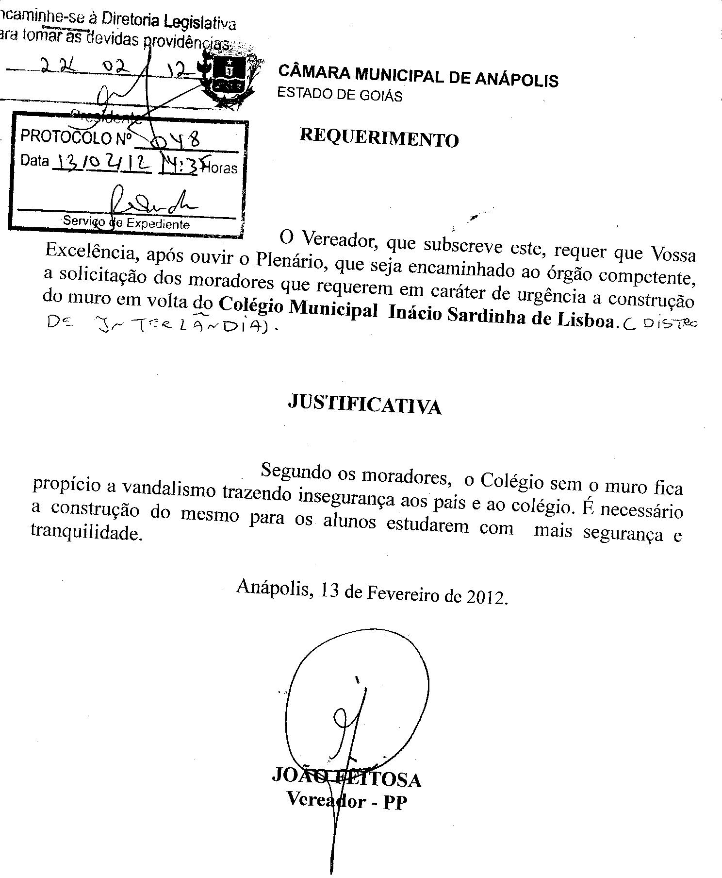 O VEREADOR, QUE SUBSCREVE ESTE, REQUER QUE VOSSA EXCELÊNCIA, APÓS OUVIR O PLENÁRIO, QUE SEJA ENCAMINHADO AO ÓRGÃO COMPETENTE, A SOLICITAÇÃO DOS MORADORES QUE REQUEREM EM CARÁTER DE URGÊNCIA A CONSTRUÇÃO DO MURO EM VOLTA DO COLÉGIO MUNICIPAL INÁCIO SARDINHA DE LISBOA. C DISTRITO DE INTERLÂNDIA.