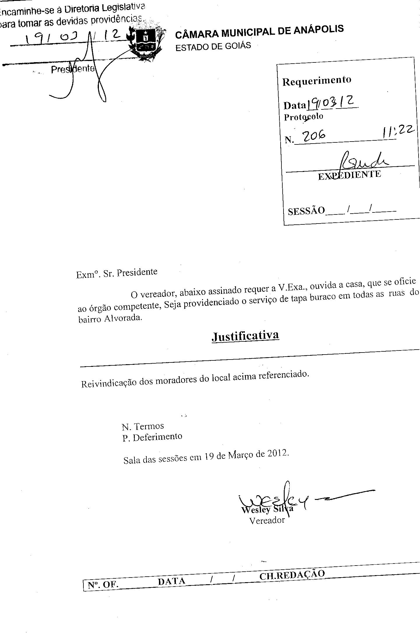 O VEREADOR, ABAIXO ASSINADO REQUER A V.EXA., OUVIDA A CASA, QUE SE OFICIE AO ÓRGÃO COMPETENTE, SEJA PROVIDENCIADO O SERVIÇO DE TAPA BURACO EM TODAS AS RUAS DO BAIRRO ALVORADA.
