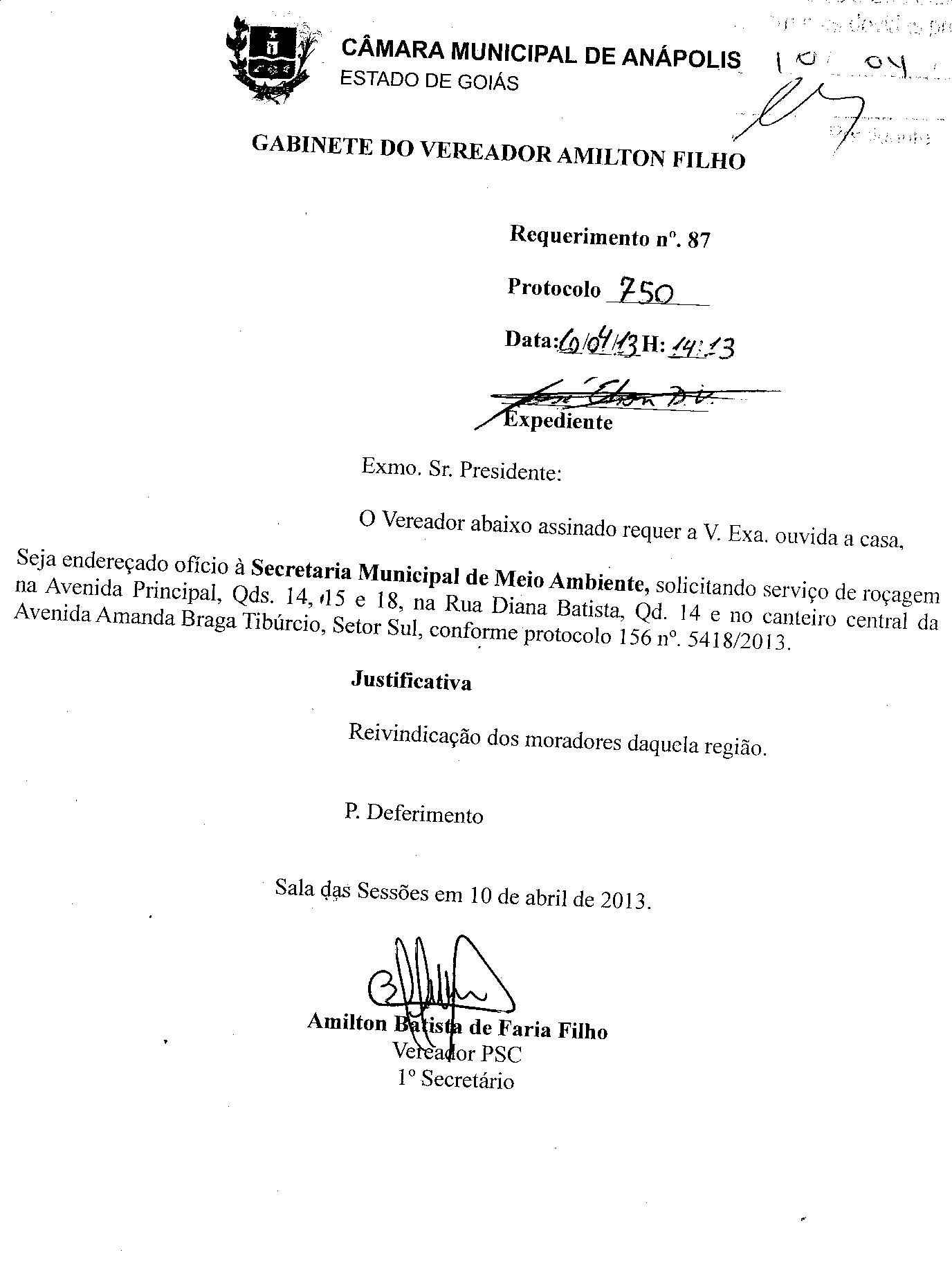 À SECRETARIA MUNICIPAL DE MEIO AMBIENTE, SOLICITANDO SERVIÇO DE ROÇAGEM NA AVENIDA PRINCIPAL, QDS. 14, 15 E 18, NA RUA DIANA BATISTA, QD. 14 E NO CANTEIRO CENTRAL DA AVENIDA AMANDA BRAGA TIBÚRCIO, SETOR SUL, CONFORME PROTOCOLO 156 Nº. 5418/2013.
