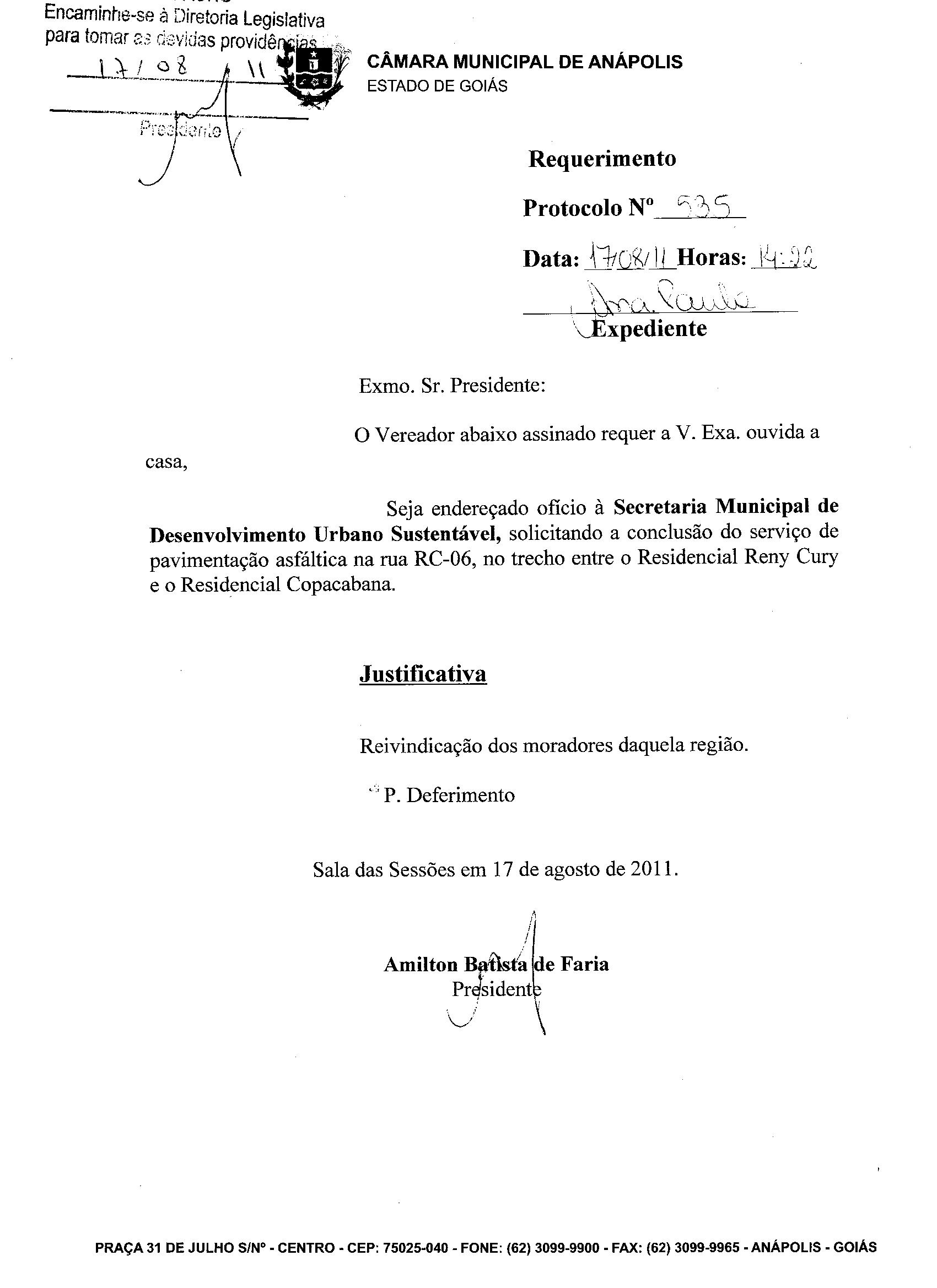 O VEREADOR ABAIXO ASSINADO REQUER A V.EXA.,OUVIDA A CASA,SEJA ENDEREÇADO OFÍCIO À SECRETARIA MUNICIPAL DE DESENVOLVIMENTO URBANO SUSTENTÁVEL, SOLICITANDO A CONCLUSÃO DO SERVIÇO DE PAVIMENTAÇÃO ASFÁLTICA NA RUA RC-06, NO TRECHO ENTRE O RESIDENCIAL RENY CURY E O RESIDENCIAL COPACABANA.